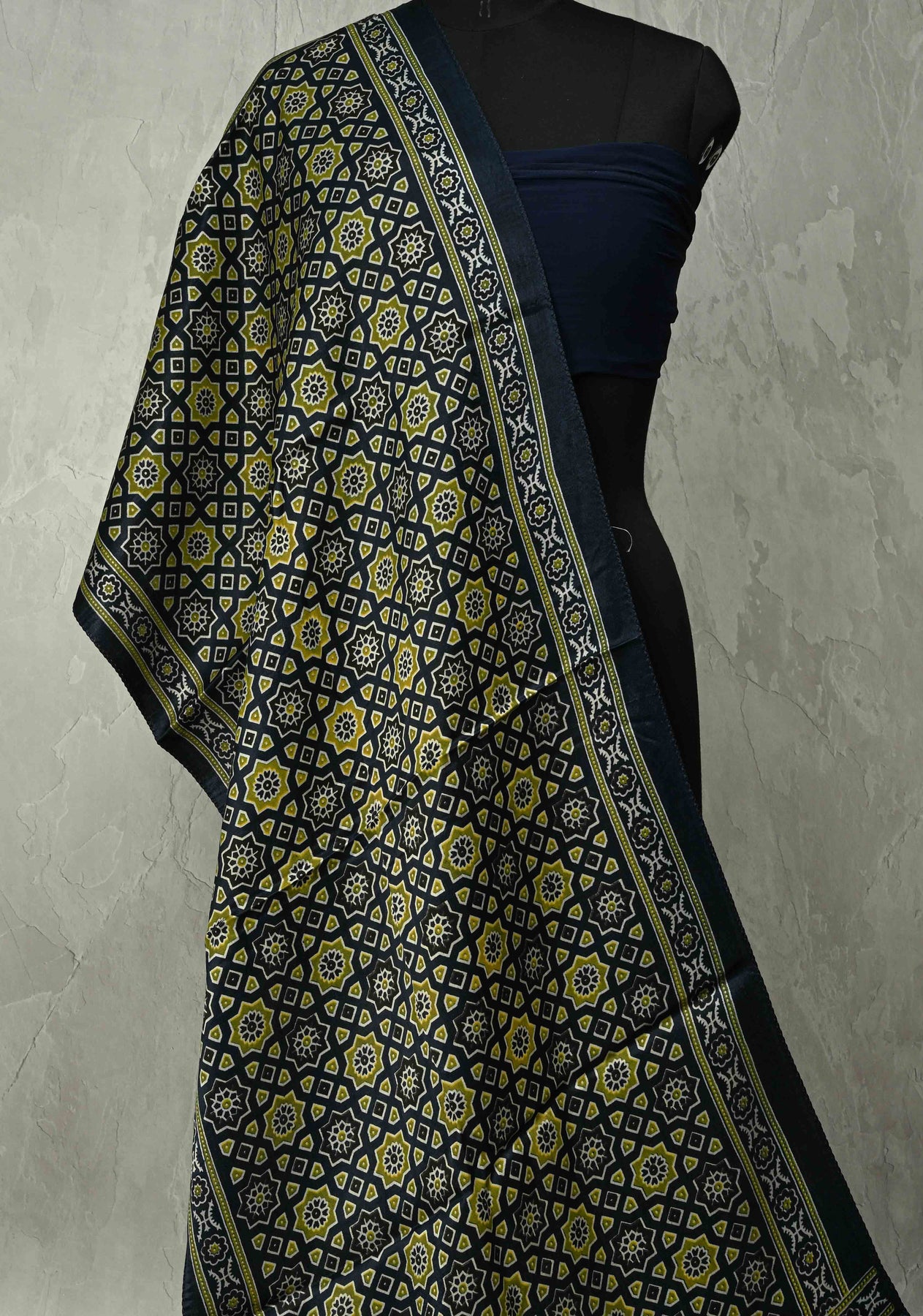 This Authentic Prussian Blue Modal Silk Dupatta is a stunning accessory that beautifully blends traditional craftsmanship with contemporary elegance. Made from soft, flowing modal silk, it offers a lightweight feel and a graceful drape. The dupatta is adorned with intricate Ajrakh hand block prints, showcasing timeless geometric and floral patterns that reflect the rich heritage of Indian block printing. Perfect to pair with ethnic outfits or fusion wear, this dupatta adds a touch of artisanal charm and sophistication to any ensemble.