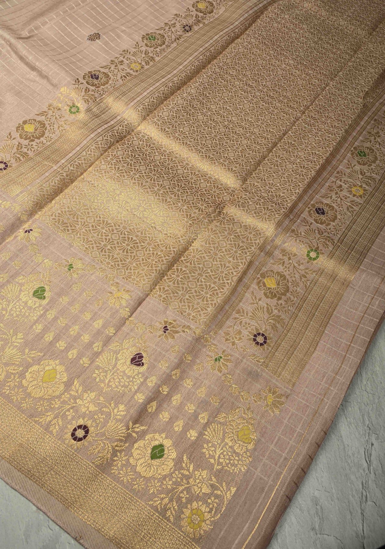 This Taupe Banarasi Semi Crepe Saree combines understated elegance with classic craftsmanship. Featuring subtle self-check patterns across the body, the saree is enhanced with delicate Meenakari buttas that add a refined shimmer. Its matching border frames the drape gracefully, creating a balanced and sophisticated look. Lightweight and comfortable, this saree is perfect for festive occasions, casual celebrations, and elegant daytime events where timeless style is appreciated.