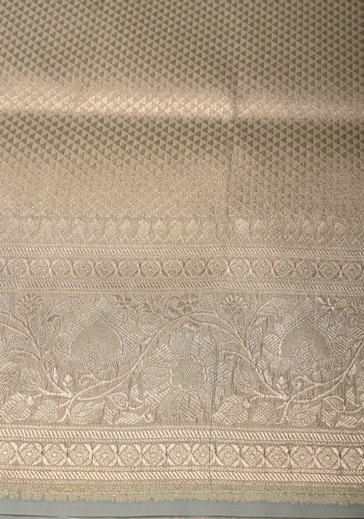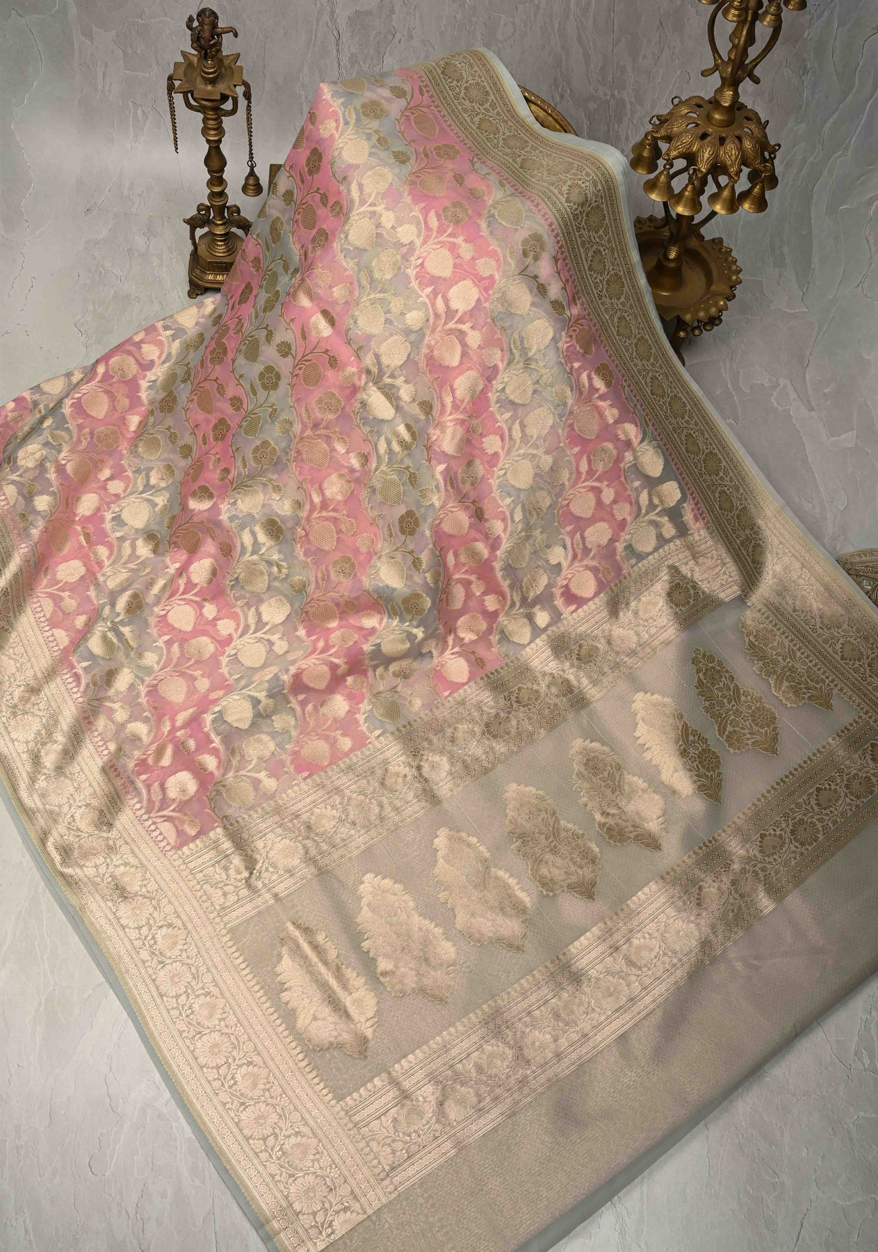 Embrace subtle sophistication with this dusty rose and sage green Banarasi semi-kora saree, adorned with a graceful Leheria pattern that flows effortlessly across the sheer fabric. The saree is beautifully enhanced with an intricately woven floral jaal, adding depth and traditional charm to its soft, pastel tones. A finely detailed zari border frames the saree, lending a touch of regal elegance and shimmer. Lightweight yet luxurious, this saree is an ideal choice for festive gatherings, intimate weddings, or daytime celebrations where understated elegance speaks volumes.