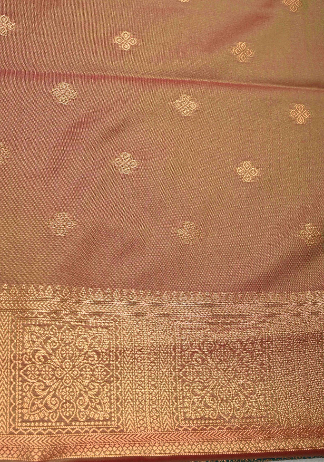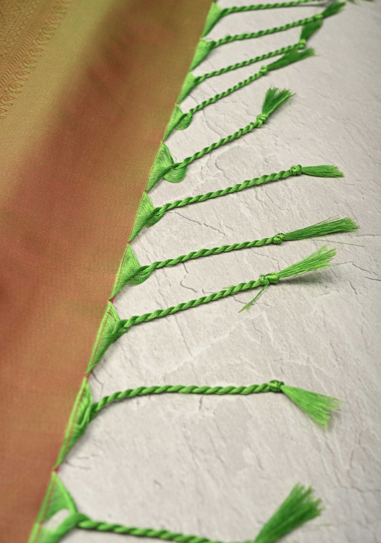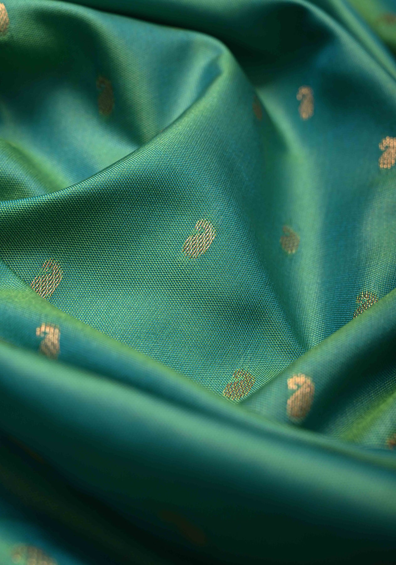 Radiate timeless charm in this Green Dual Tone Kanchi Semi Silk Saree, a graceful fusion of heritage weaving and contemporary design. The body of the saree features beautifully woven paisley zari buttas that glimmer subtly against the rich dual-tone green base, lending a refined, festive appeal. The soft sheen and color play of the semi silk fabric enhance its elegance with every drape.