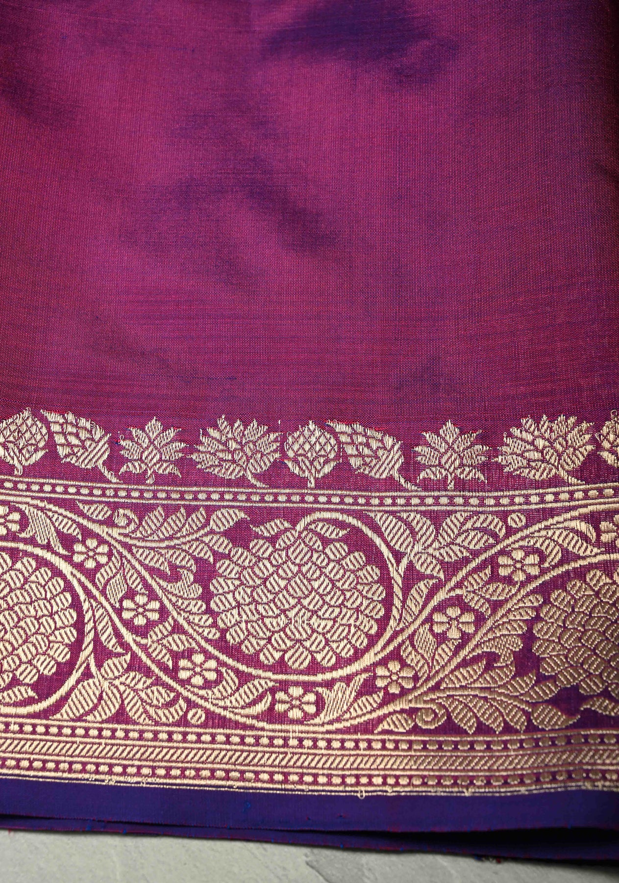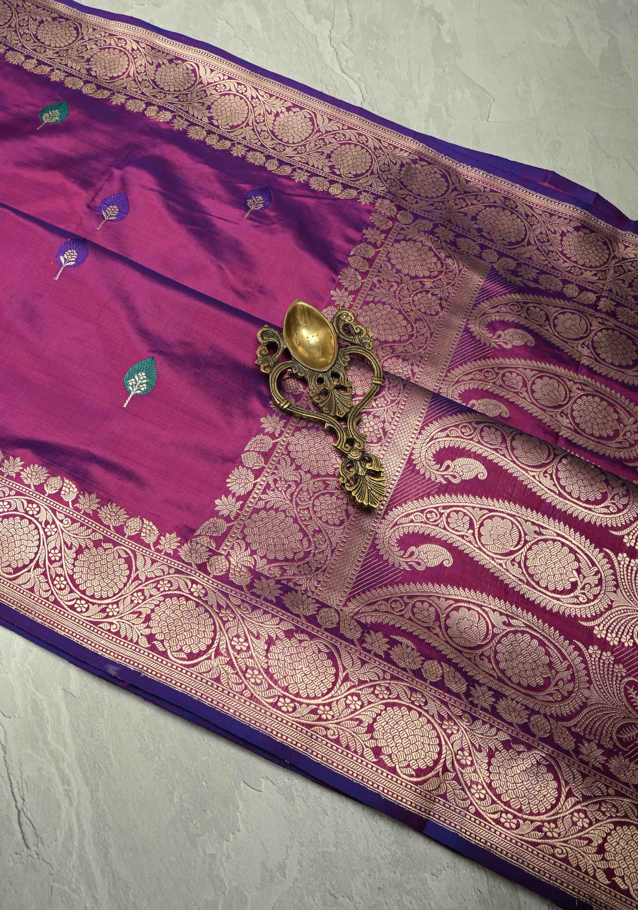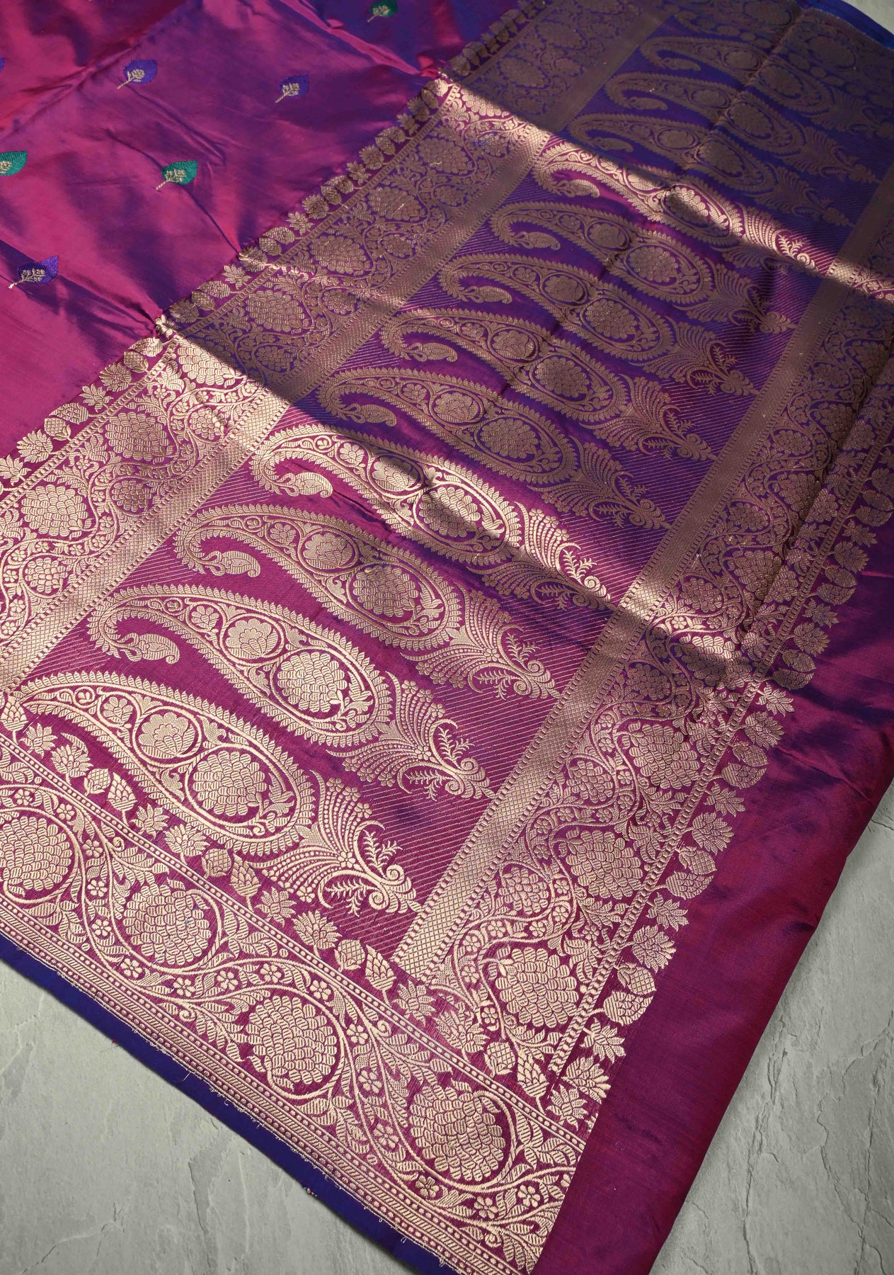 This Purple Dual Tone Banarasi Katan Silk Saree captures the essence of Banaras’ rich weaving heritage. Crafted from katan silk, it features a mesmerizing dual-tone finish that shimmers beautifully with every movement. The saree is intricately adorned with Resham Meenakari buttas, showcasing vibrant threadwork and fine zari detailing that add depth and artistry. A graceful zari border frames the saree, enhancing its traditional charm and opulent appeal. Perfect for weddings, festive occasions, and cultural celebrations, this saree is a timeless masterpiece of elegance and craftsmanship.