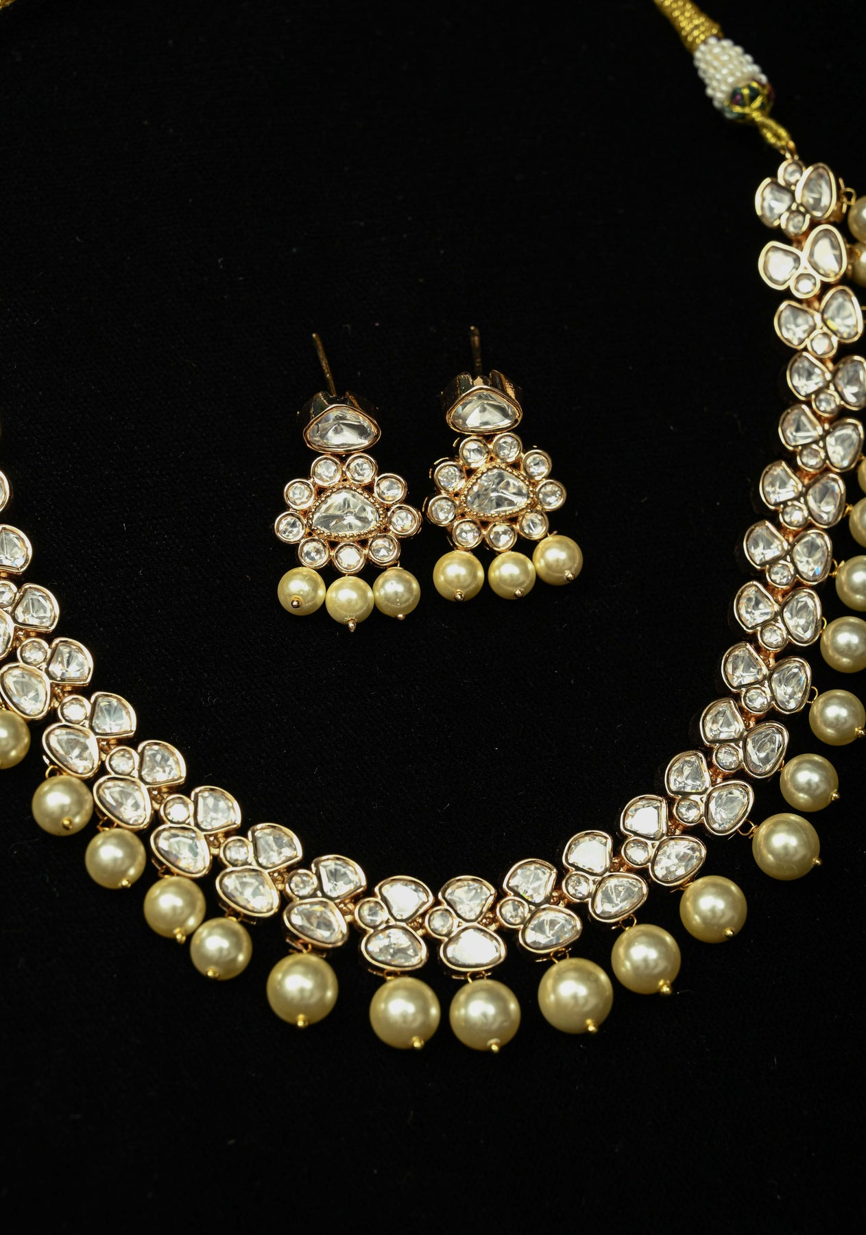 This Kundan Necklace Set is expertly crafted and features stunning white kundan and elegant off-white shell pearls. The heavy necklace set exudes luxury and sophistication, perfect for adding a touch of glamour to any outfit. Elevate your style with this timeless piece.