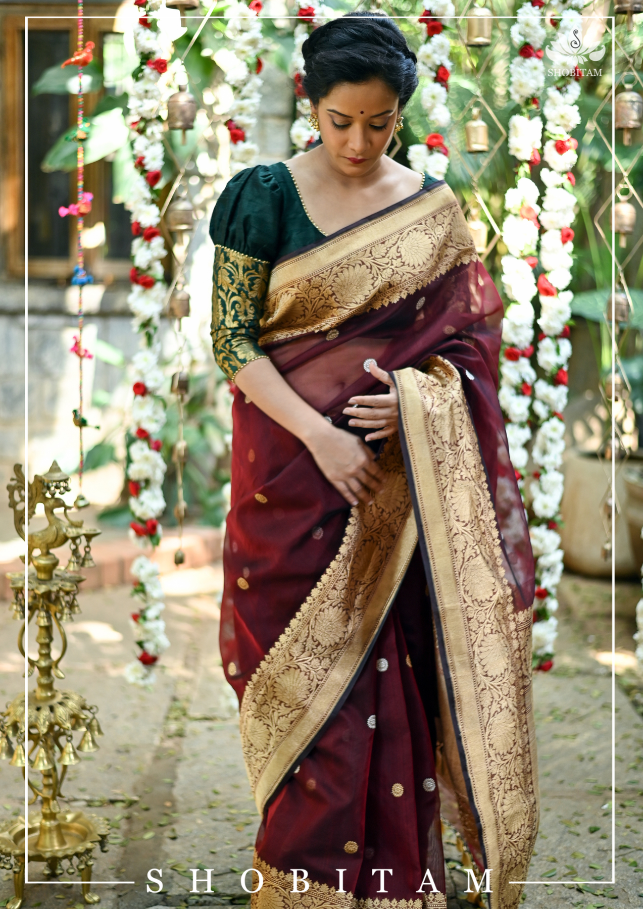 This saree handwoven in Banaras comes in a mesmerizing Maroon dual shade.