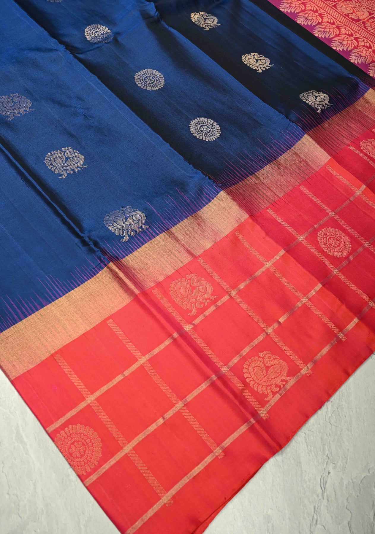 The harmonious blend of subtle zari motifs and bold checkered border adds sophistication and traditional charm, making it ideal for weddings, festive celebrations, and special cultural occasions. A timeless choice that combines craftsmanship with contemporary appeal.