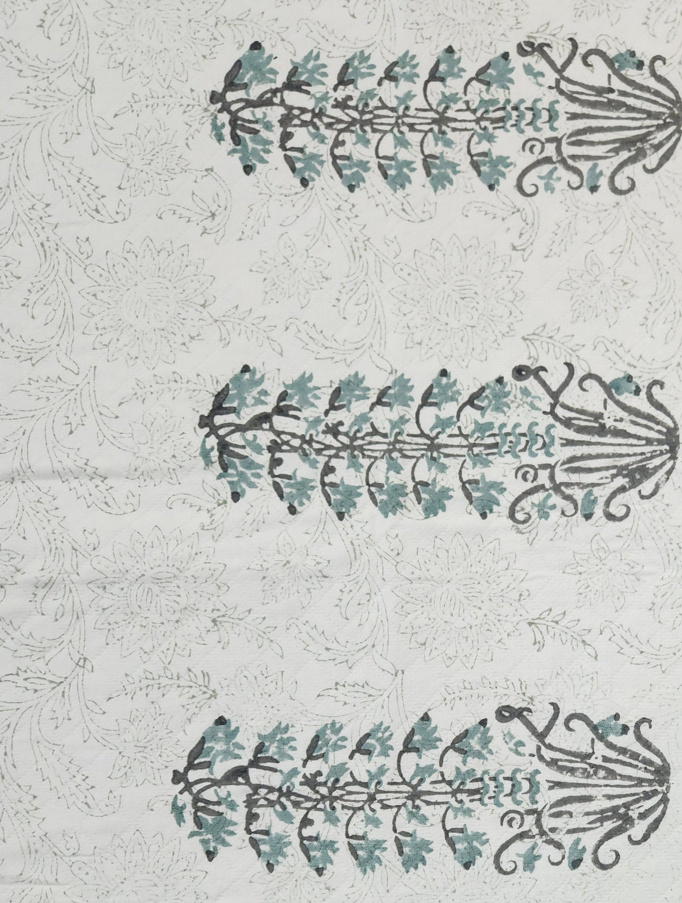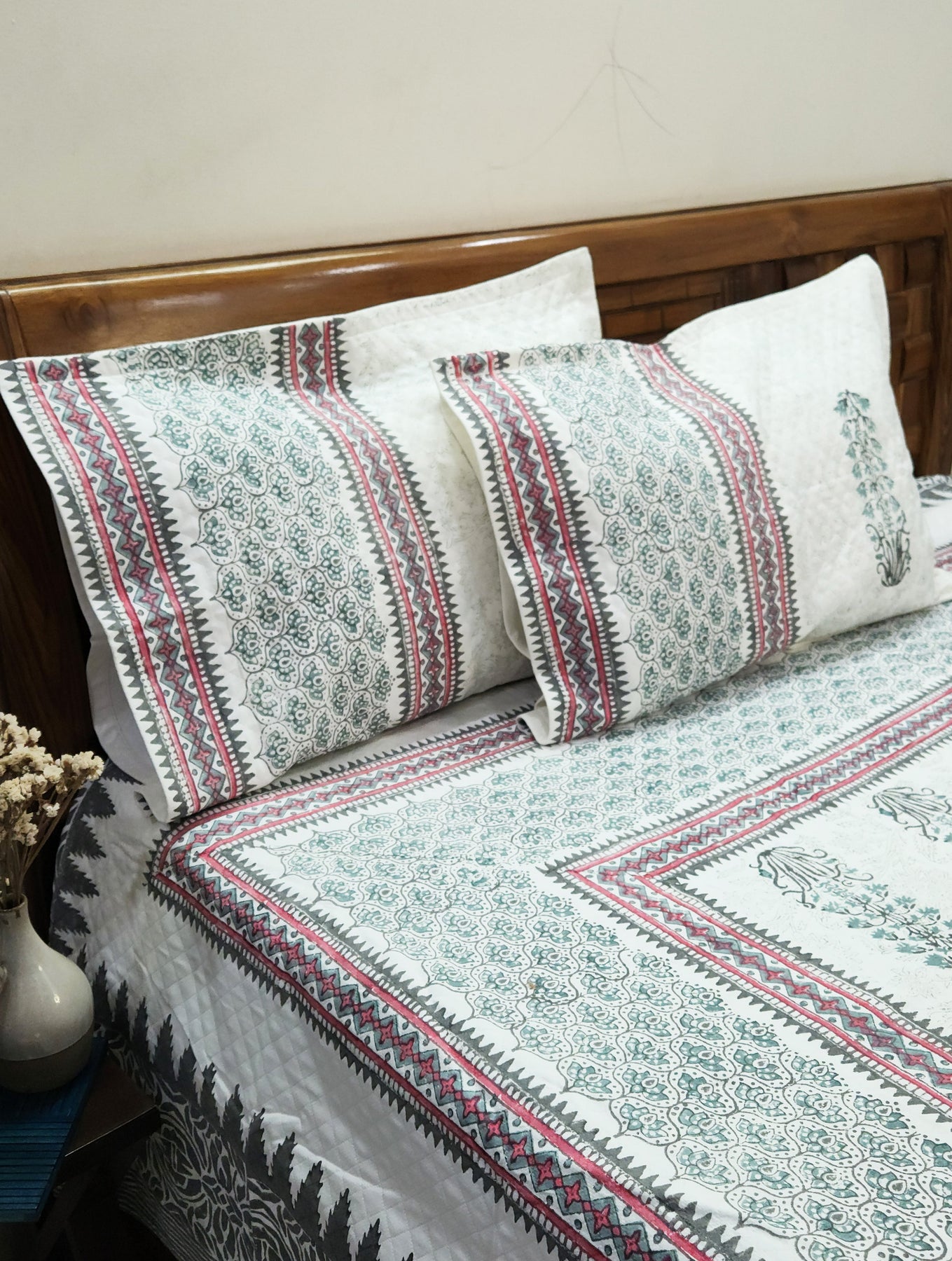 This bedcover set is an exclusive creation of hand block printing. It contains 1 cover and 2 pillow cases. Cotton Matelasse fabric used in this bedcover is of pure cotton with diamond structure jacquard which gives a quilting experience.
