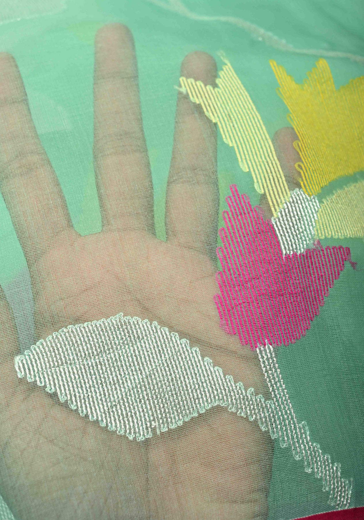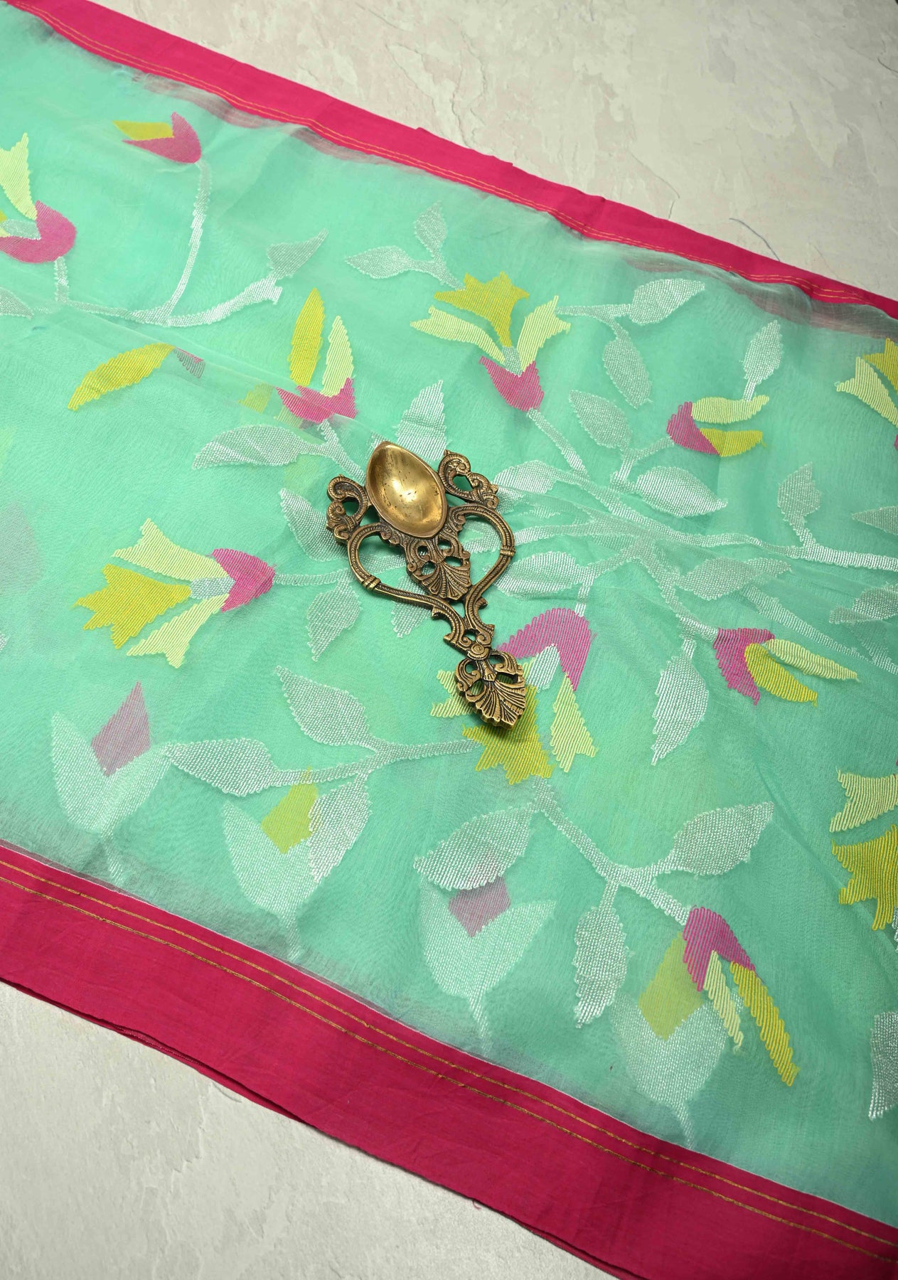 This delicate Mint Green Silk Muslin Saree embodies grace, elegance, and timeless craftsmanship. Woven from soft, airy silk muslin, it offers a lightweight drape and subtle sheen, perfect for sophisticated occasions. The saree features intricate Resham Jamdani weaving, showcasing fine geometric and floral patterns that highlight artisanal precision. A contrast border adds a striking finish, enhancing the overall elegance and visual appeal. Ideal for weddings, festive celebrations, or formal gatherings, this saree is a refined choice for those who appreciate classic artistry with contemporary charm.