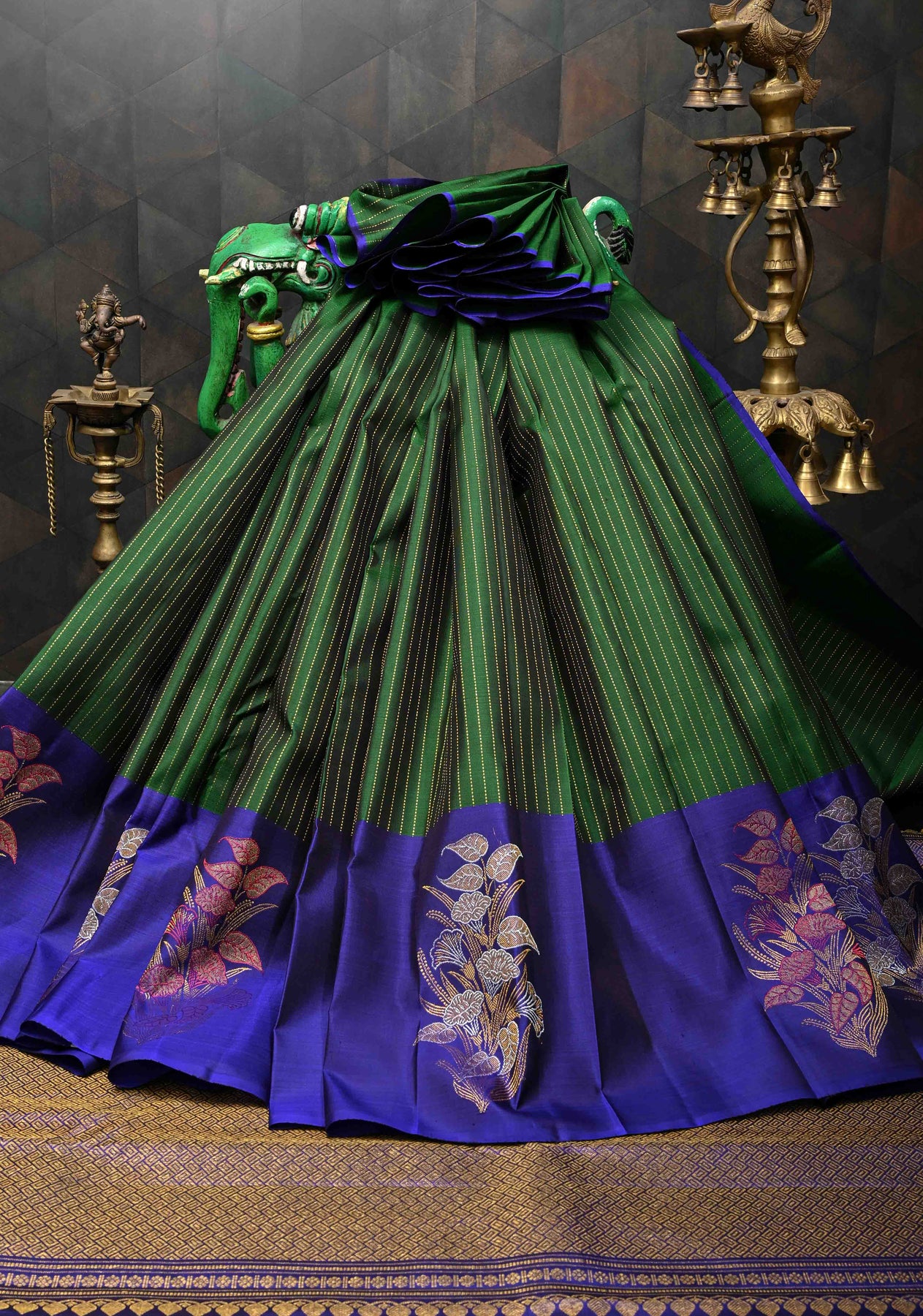 Bottle Green Pure Kanjivaram Silk Saree with Vertical Zari Stripes and Meenakari Distinct Floral Buttas on Contrast Border | SILK MARK CERTIFIED