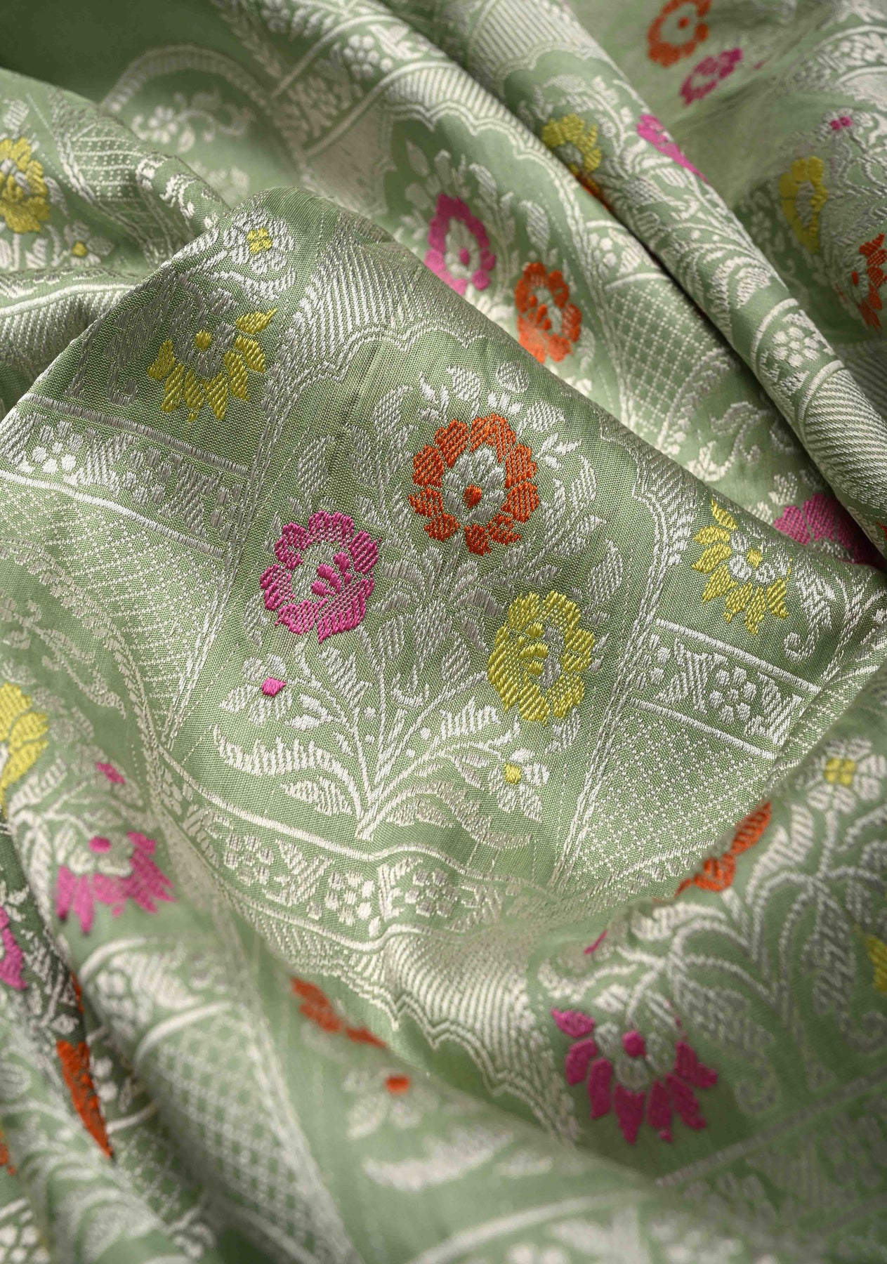 Radiating timeless elegance and refined craftsmanship, this Pista Green Banarasi Katan Silk Saree is a true testament to the weaving heritage of Banaras. Crafted from rich pure Katan silk, the saree features exquisite Meenakari arch brocade work, intricately woven with fine resham and zari threads to create a mesmerizing interplay of color and texture.