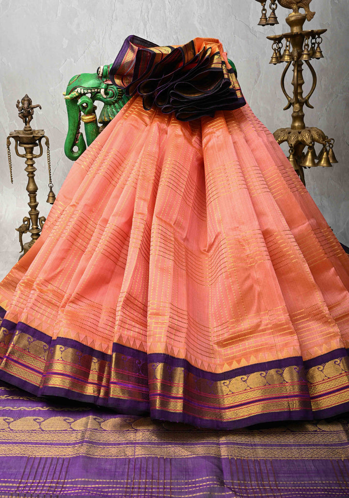 Radiating soft elegance, this Salmon Dual Tone Kanchi Silk Cotton Saree is a graceful blend of tradition and modern charm. The dual-tone effect creates a subtle play of light across the fabric, enhancing its beauty with every movement. Intricately woven zari checks lend structure and sophistication, while the contrast zari borders add a rich, festive finish. Crafted from a silk-cotton blend, this saree drapes beautifully and offers breathable comfort—perfect for weddings, poojas, or any special occasion that calls for understated opulence.