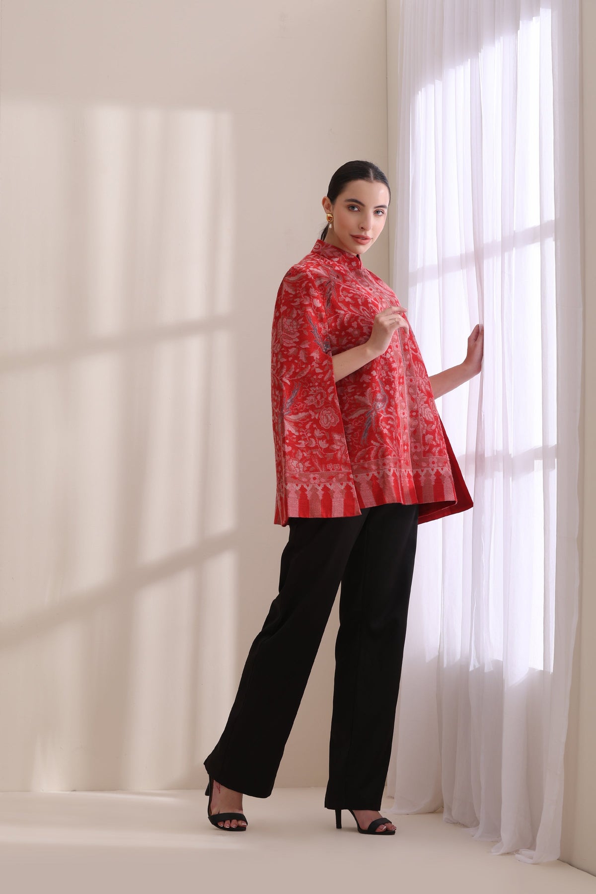 The Mithudi woven cape exudes contemporary elegance with its rich red hue and intricate floral motifs. Crafted from premium fabric, this cape features a striking mandarin collar and seamless slit sleeves, blending tradition with modern silhouette. Perfect for elevating festive or formal ensembles, it offers timeless style and luxurious comfort