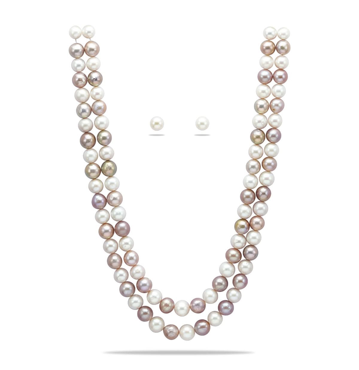 The 2-Strand Freshwater Favorite Multicolor Pearl Necklace Set is a vibrant and elegant accessory that adds a touch of color to any ensemble. Featuring two strands of beautifully selected freshwater pearls in a delightful array of colors, this necklace showcases shades ranging from soft pinks and warm peaches to creamy whites and subtle grays. Each pearl is meticulously handpicked for its luster and smooth surface, creating a harmonious blend of hues that complement each other perfectly. The set is completed with matching earrings, making it a versatile and charming addition to both casual and formal wear