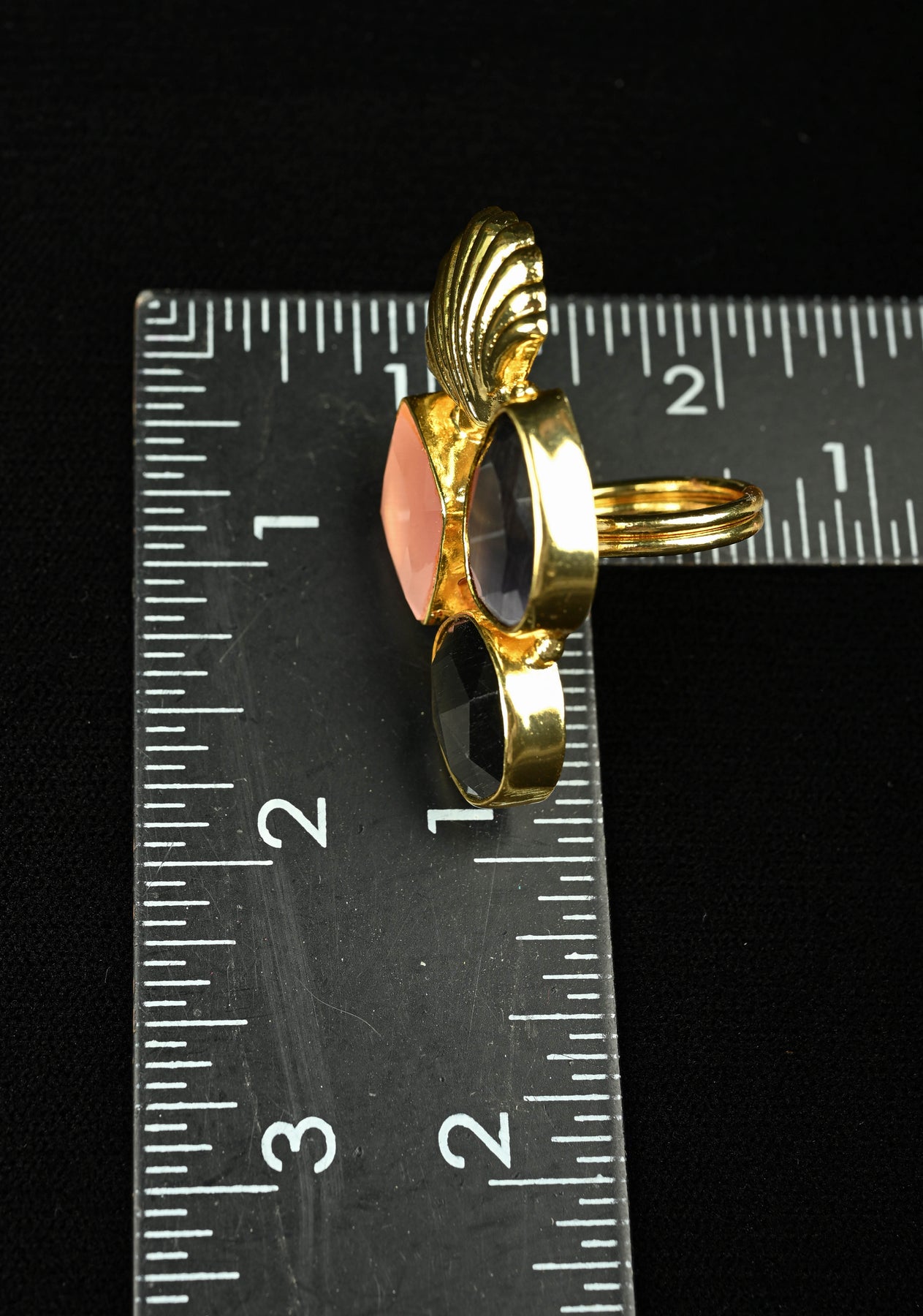 Elevate your style with this handcrafted Artisan Monalisa Glass Ring. Featuring a striking trio of faceted rhombus, teardrop, and round stones, it is crowned with an elegant gold-tone shell motif. This statement piece blends geometric modernism with coastal charm, offering a luminous glow perfect for any occasion.