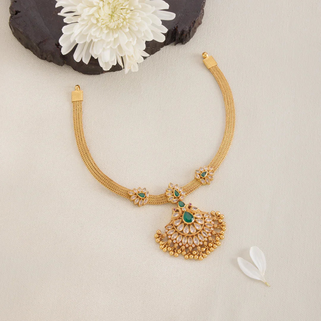 Crafted with precision, the Aarika Stone Short Necklace features a stunning Pear-shaped emerald stone set in an elegant CZ stones setting. This exquisite piece combines traditional craftsmanship with timeless beauty, making it a perfect accessory to enhance any outfit with a rich, sophisticated touch.