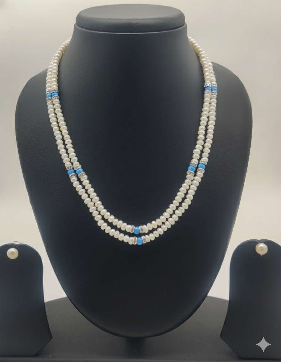 Two Strands Real Pearls Necklace Set with Blue Beads Highlights