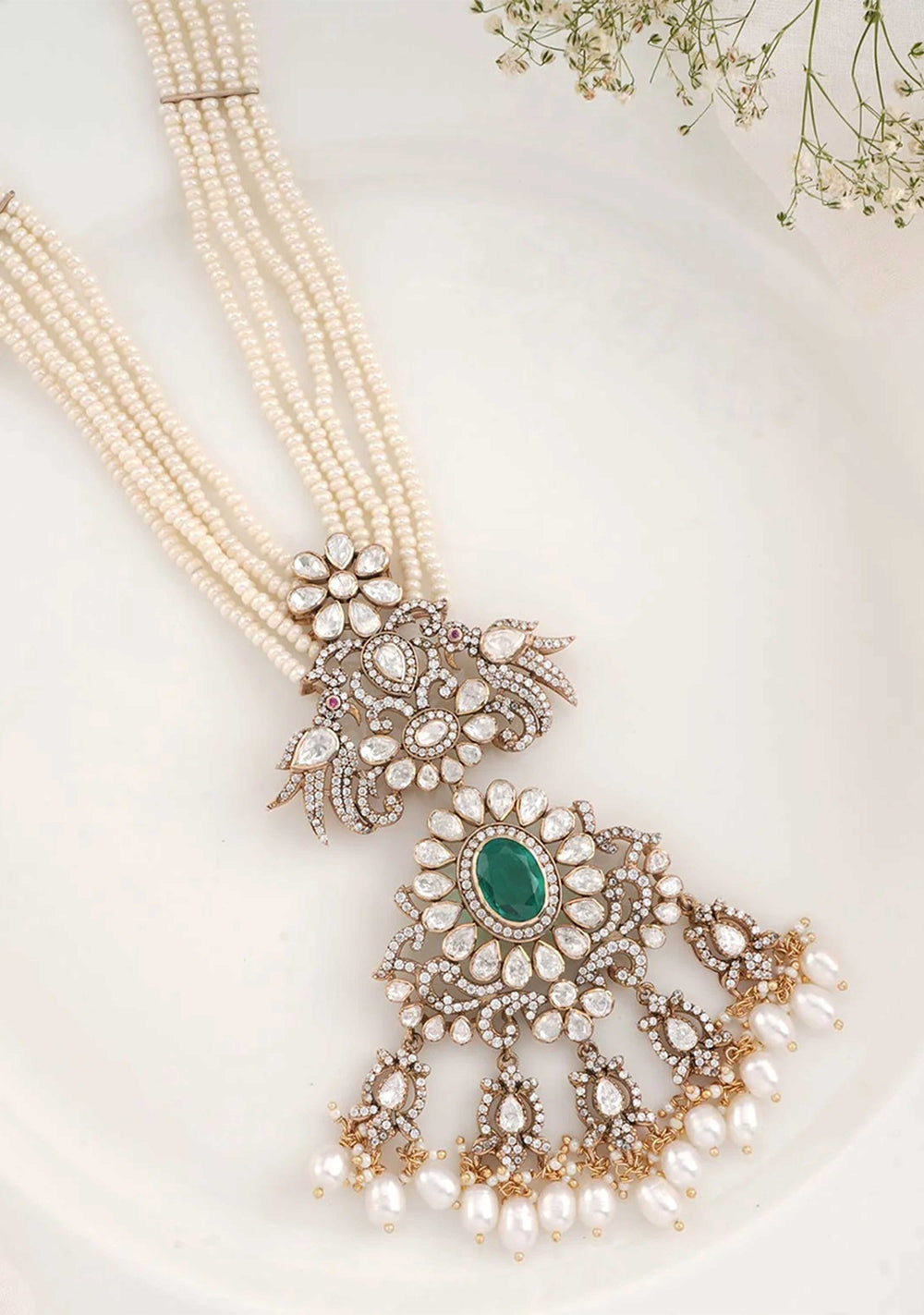 92.5 Silver Opulent White and Green Peacock Design Victorian Necklace Set