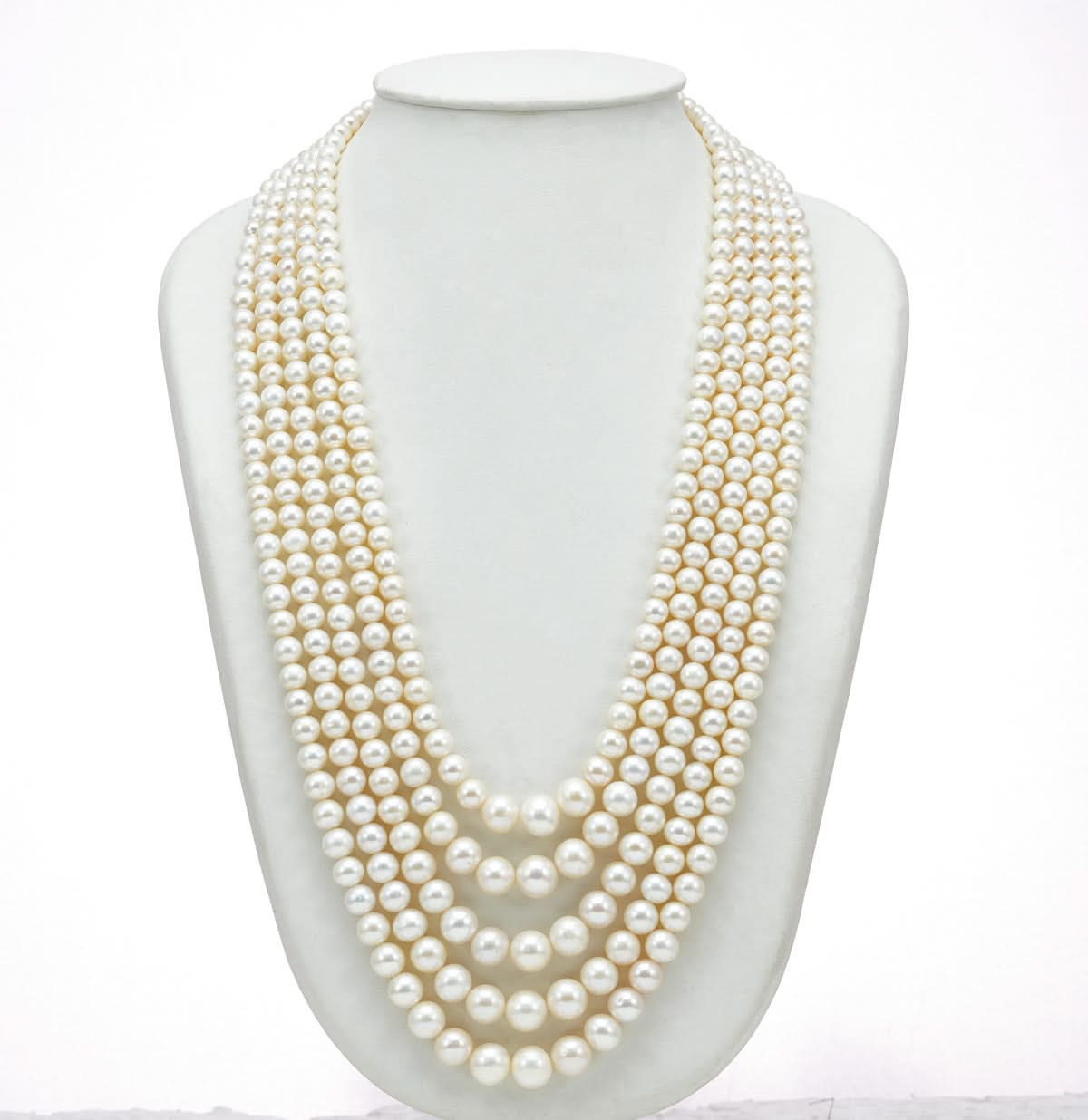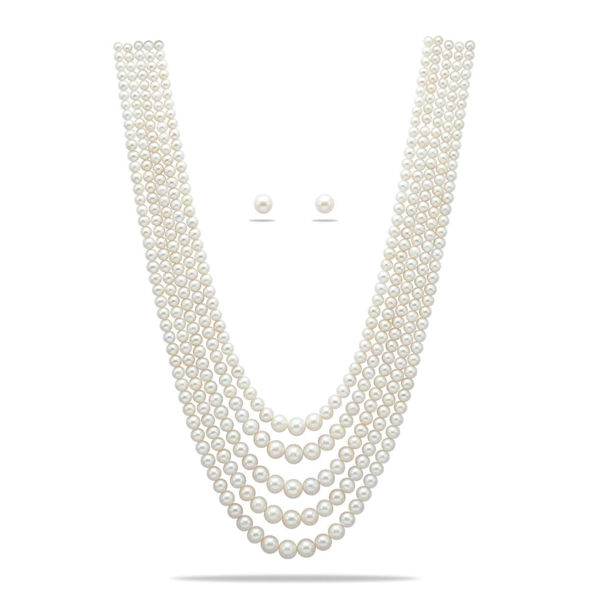 The cascading layers of pearls create a rich, layered effect, adding depth and dimension to this timeless piece. Complemented by matching pearl earrings, this necklace set embodies classic elegance, making it an exquisite choice for special occasions or to elevate everyday attire. A true symbol of sophistication, this set is perfect for those who appreciate the enduring beauty of fine pearls