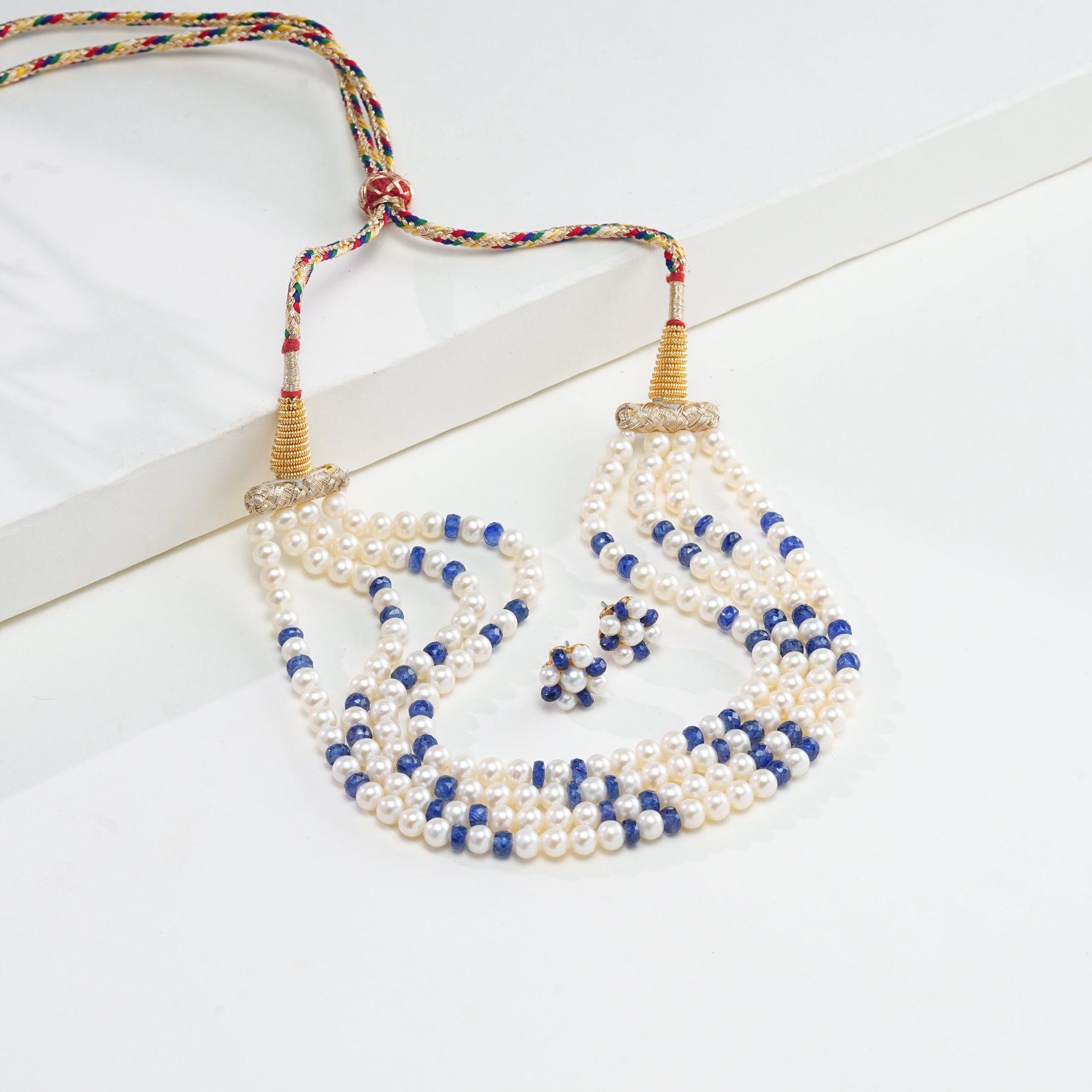 This elegant 4-strand choker and earring set features a stunning combination of pure pearls and real sapphires. The choker showcases multiple layers of lustrous pearls, each strand delicately arranged to enhance its luxurious appeal. Interspersed within the pearls are vibrant real sapphires, adding a touch of color and sophistication to the design. The earrings complement the choker with a matching display of pearls and sapphires, creating a harmonious, regal look. Perfect for special occasions, this set exudes timeless beauty and is ideal for adding a refined touch to your jewelry collection.