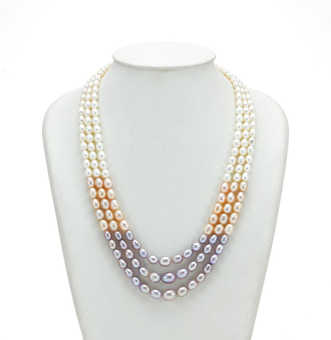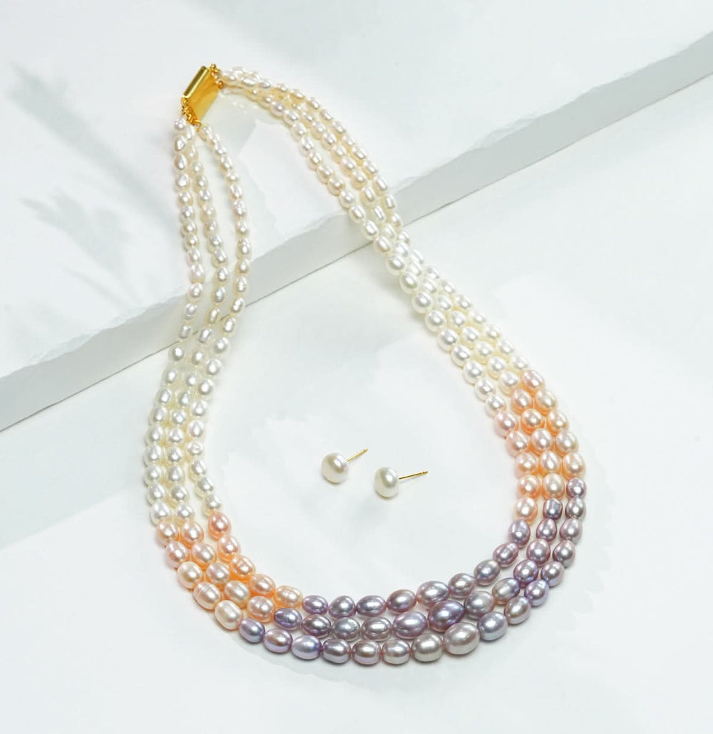 Three Strand Freshwater Sassy Multicolor Round Pearl Necklace Set