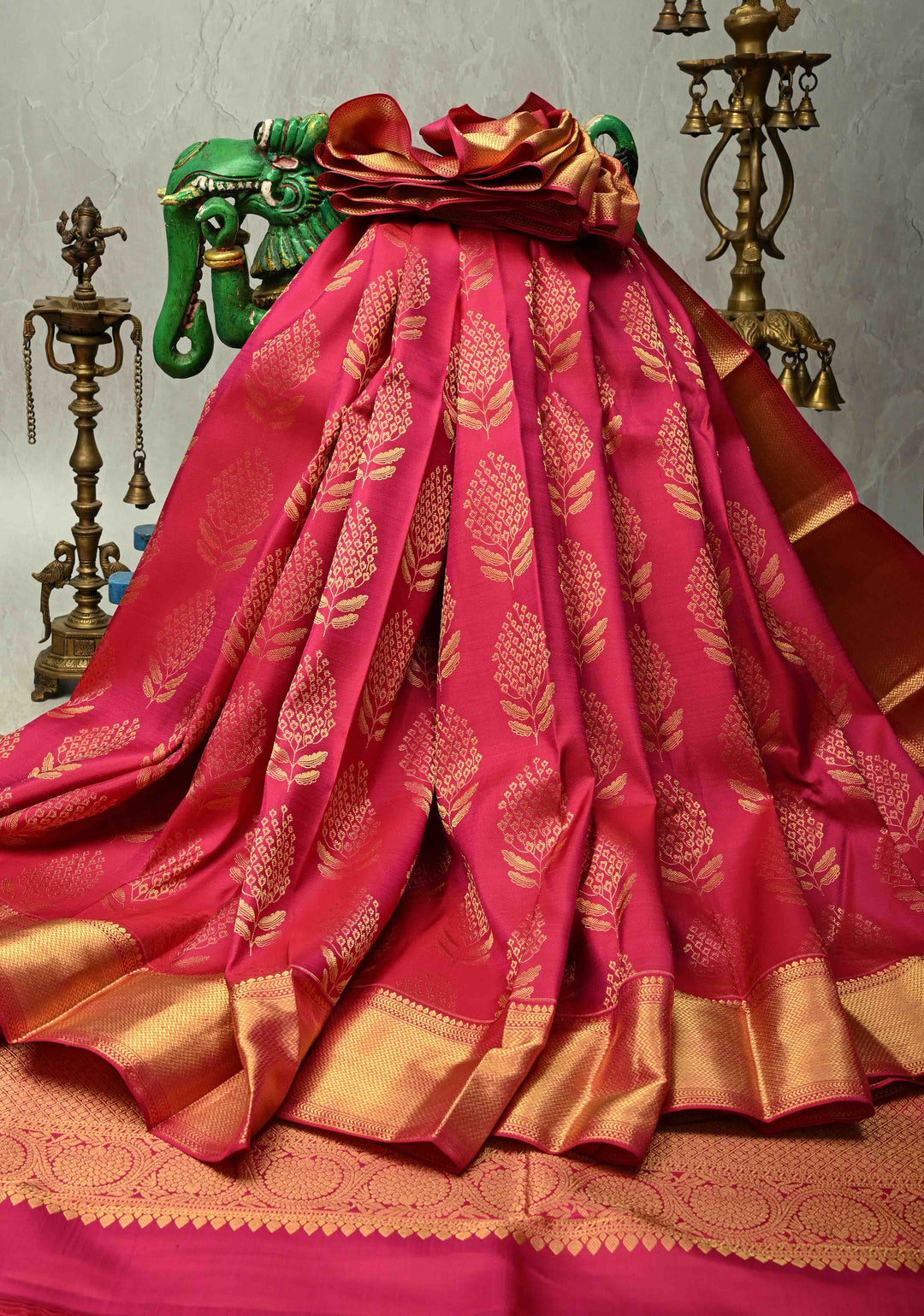 These sarees showcase specially woven designs, with the saree pleats and pallu in a matching colour that differs from the saree body. This distinct design exudes individuality.