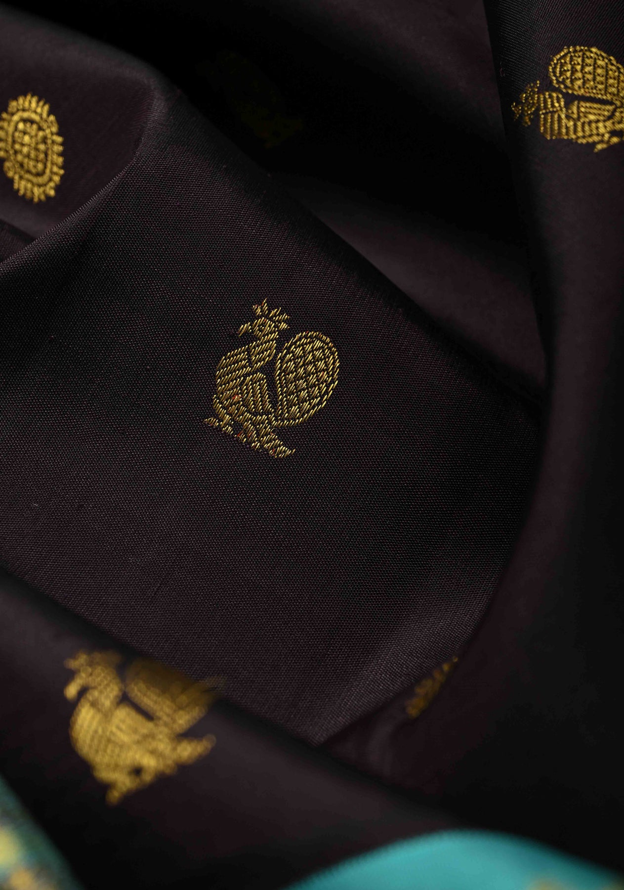 Opulent and steeped in tradition, this Deep Plum Brown Korvai Kanjivaram Pure Silk Saree is a stunning representation of South Indian heritage weaving. The deep plum-brown body is adorned with intricately woven Peacock Mandala motifs, symbolizing beauty, grace, and spiritual harmony. Crafted using the labor-intensive Korvai technique, the saree features a contrast wide zari border that is seamlessly interlocked to the body, showcasing expert craftsmanship. Woven from pure mulberry silk, this saree is ideal for weddings, temple ceremonies, and grand festive occasions where heritage and elegance matter most.