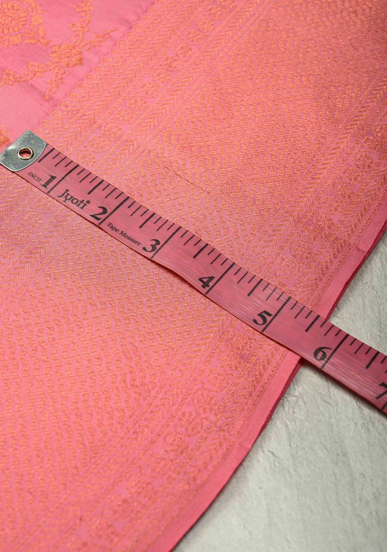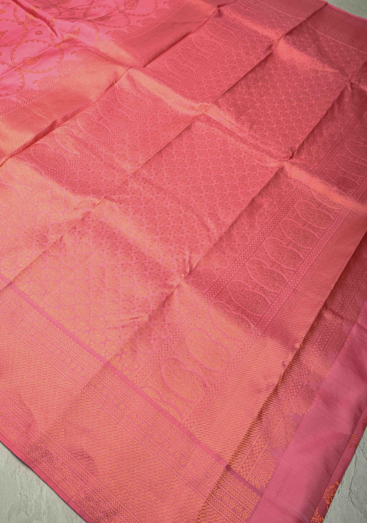 Embrace timeless elegance with this Rose Pink Pure Kanchi Silk Saree, a masterpiece of traditional craftsmanship and refined beauty. Woven from authentic Kanchipuram silk, this saree exudes a luxurious sheen and an unmatched softness that drapes gracefully.