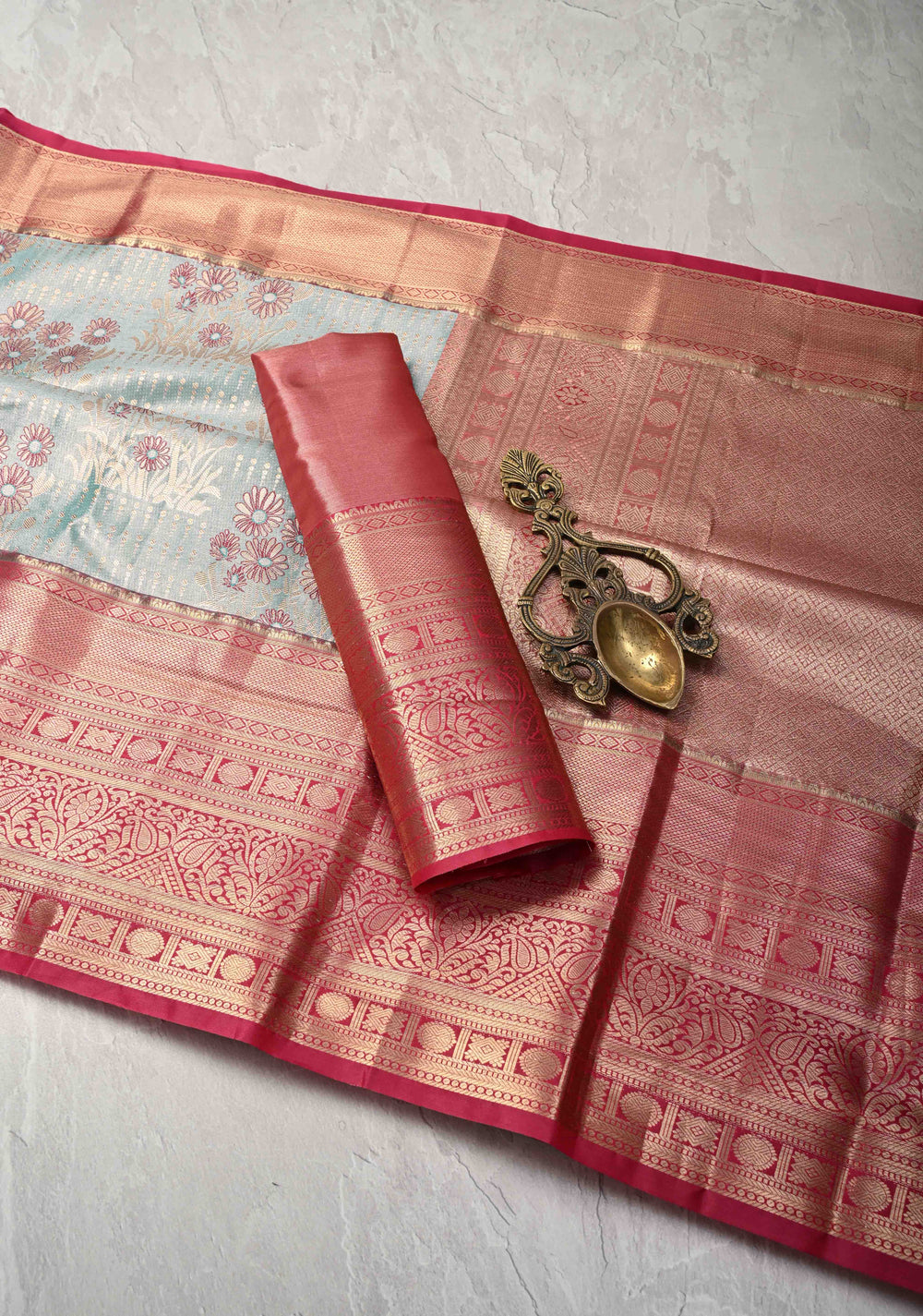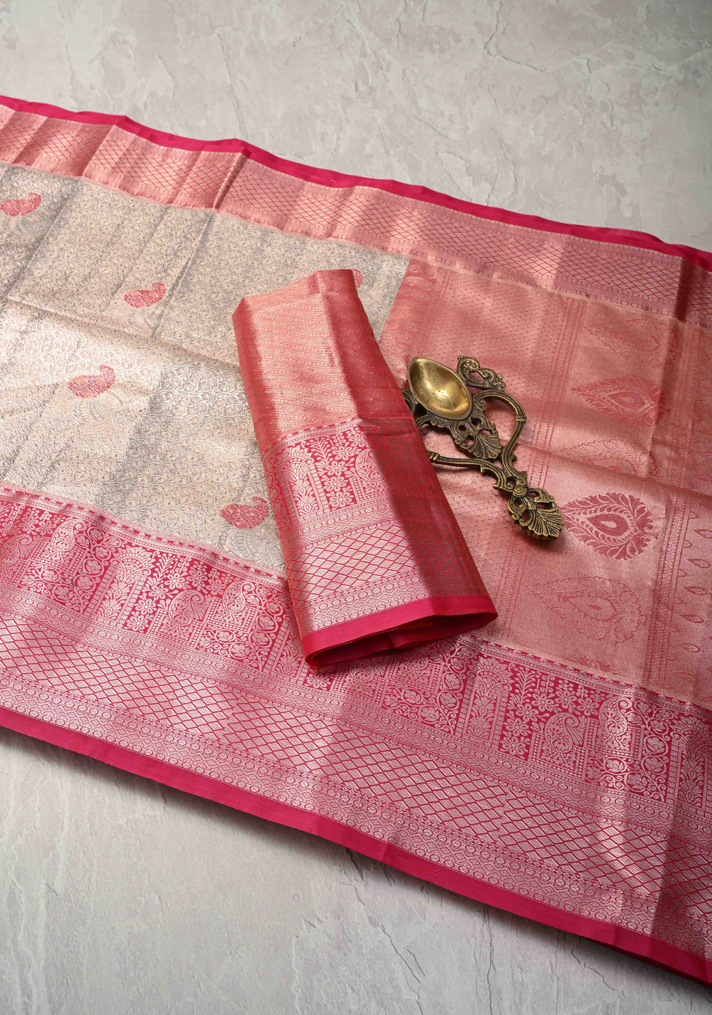Step into a world of luxury. Its delicately woven designs promise to set you apart from the crowd. Adorned with intricate Zari buttas, the sarees showcase delicate patterns woven into the fabric. These buttas add a touch of shimmer and intricate detailing, enhancing the saree's overall luxury and charm.