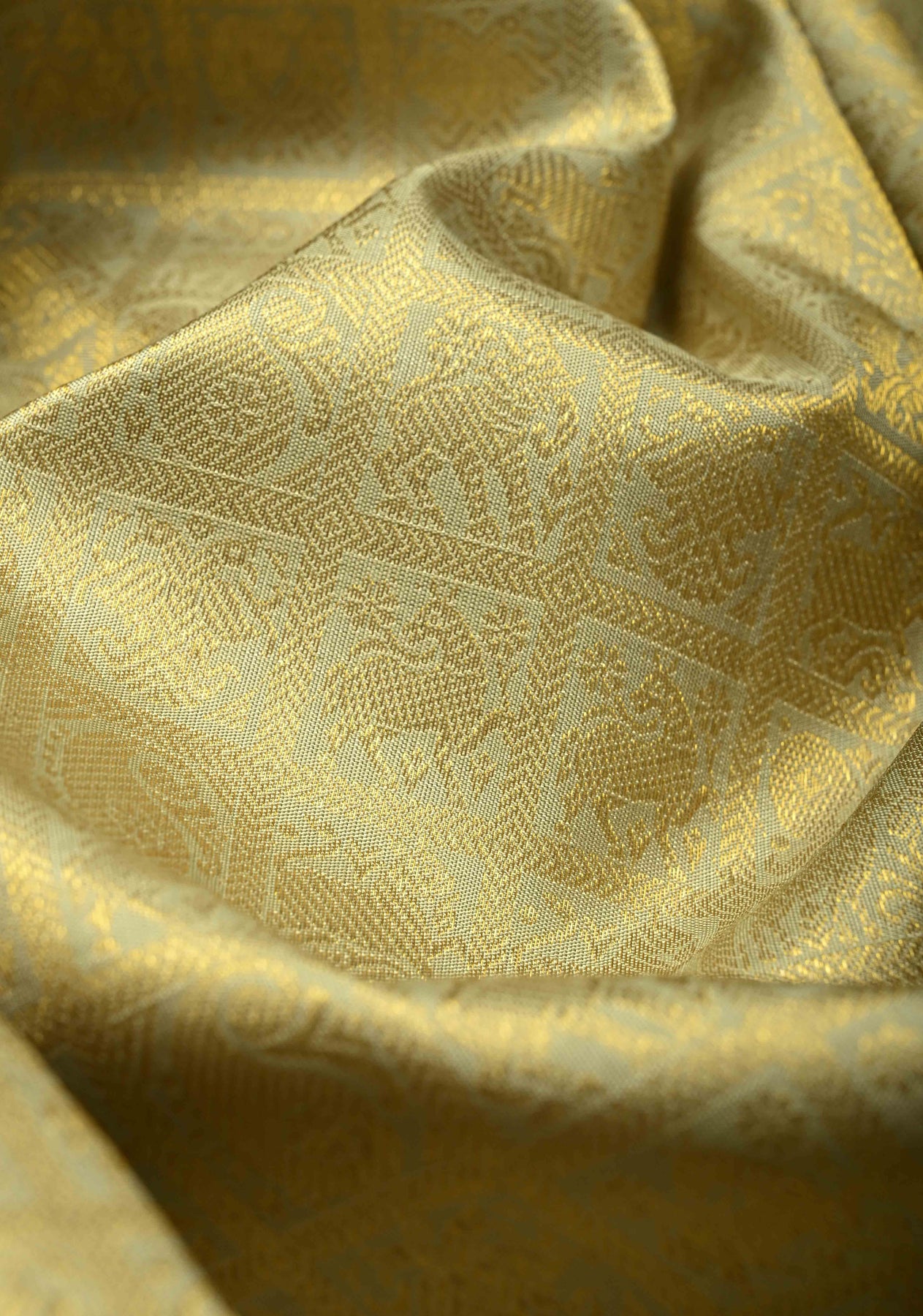Emanating timeless grace, this Pista Green Korvai Weave Kanjivaram Pure Silk Saree is a masterpiece of traditional artistry and modern charm. Crafted from luxurious pure silk, the saree features a rich Korvai weave that seamlessly blends contrasting textures and tones. The soothing pista green body is adorned with intricate Patola-inspired brocade motifs, lending it a regal yet contemporary allure.