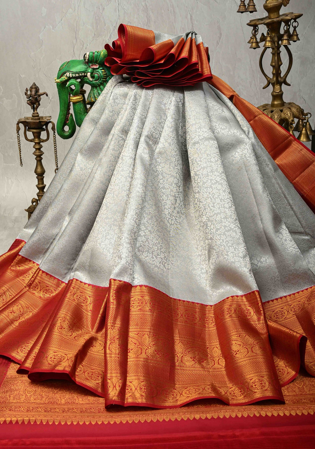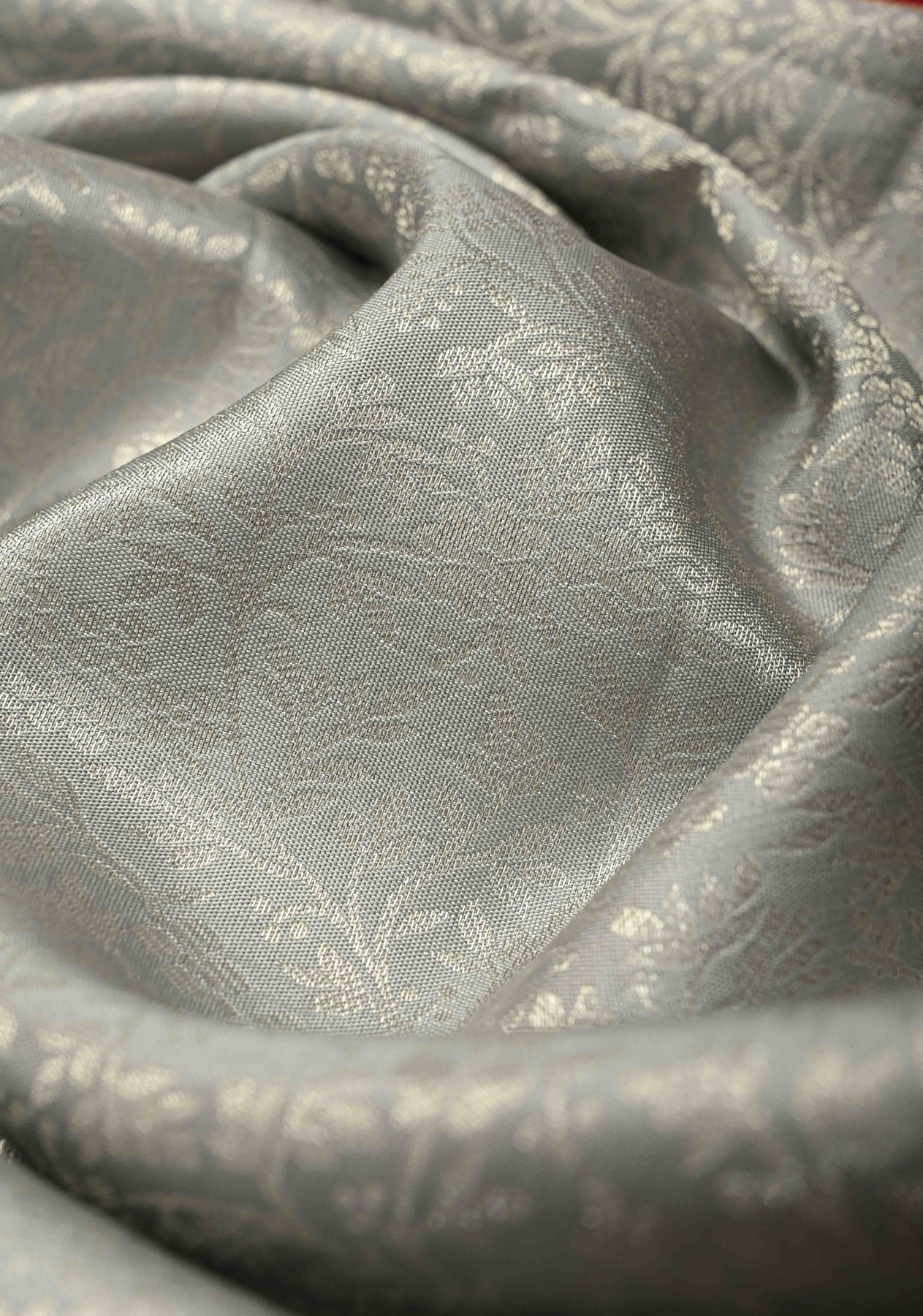 This gray pure Kanjivaram silk saree is a perfect expression of refined elegance and traditional artistry. Woven from pure silk, it features an all-over floral zari brocade jaal that adds richness and intricate detailing to the saree. The contrast zari border beautifully frames the drape, enhancing its regal appeal and creating a striking visual balance. Ideal for weddings, festive occasions, and formal celebrations, this timeless Kanjivaram saree embodies classic sophistication with a contemporary edge.