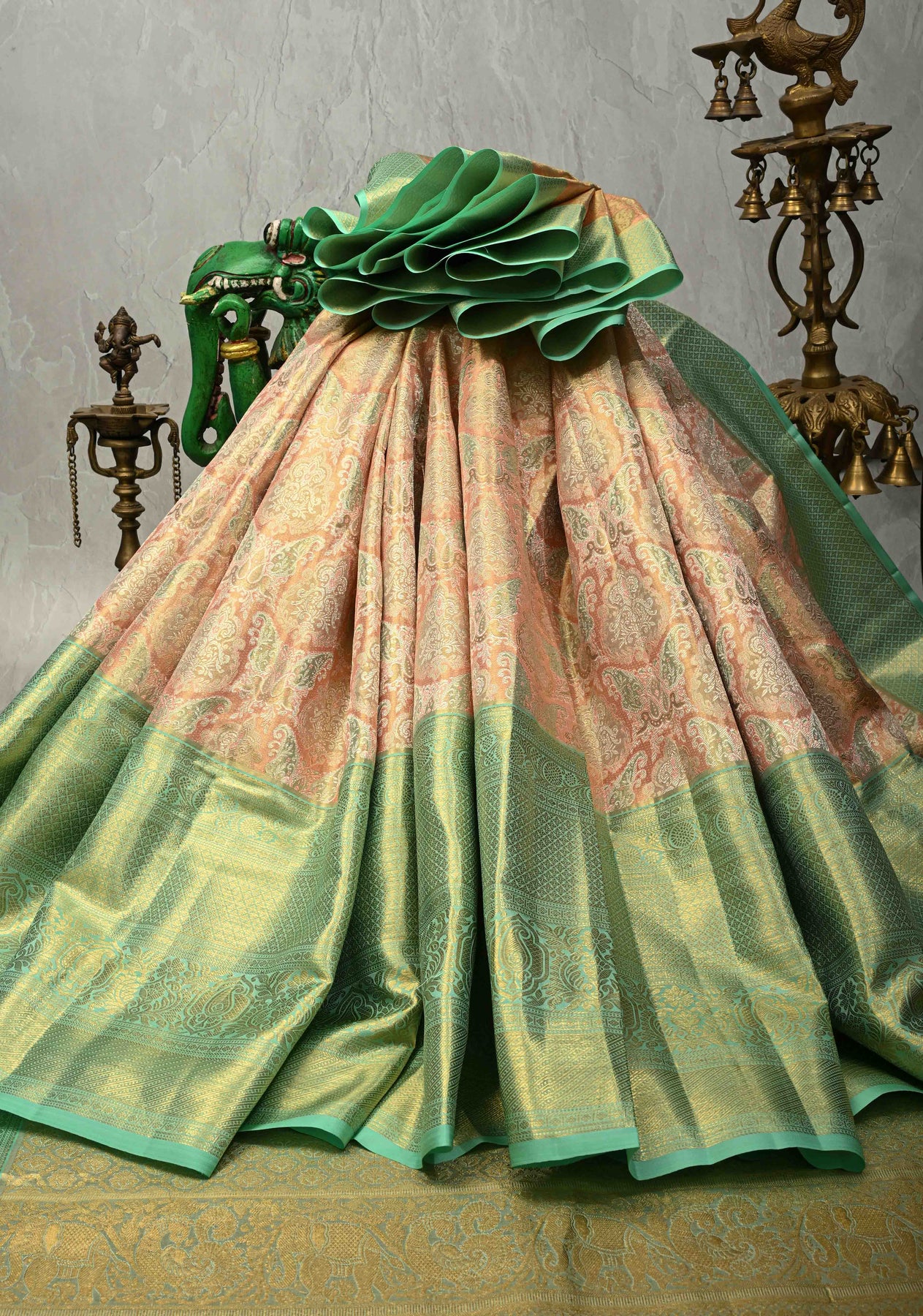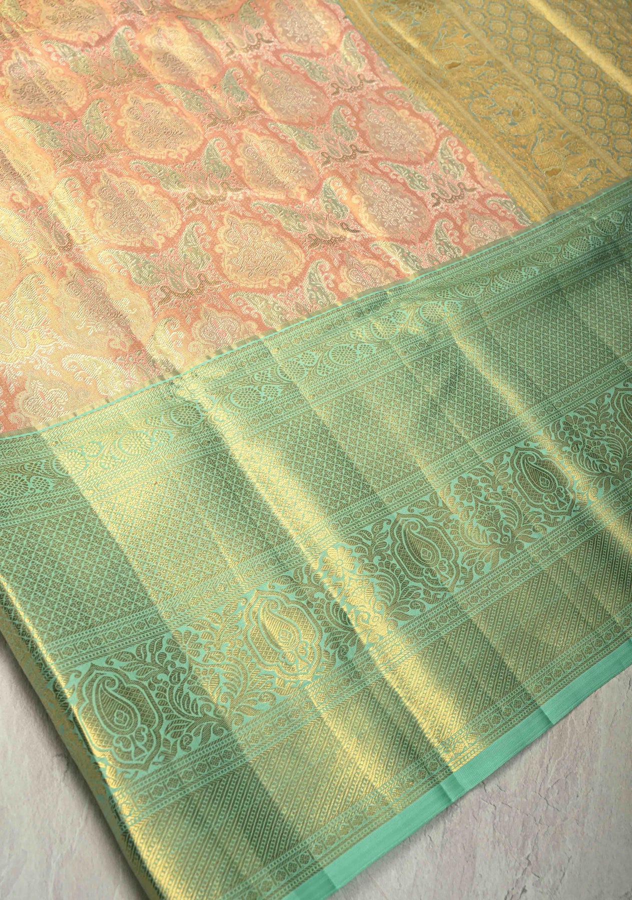 Peach Pink Pure Kanjivaram Tissue Silk Saree with Meenakari Brocade and Contrast Wide Zari Border | SILK MARK CERTIFIED