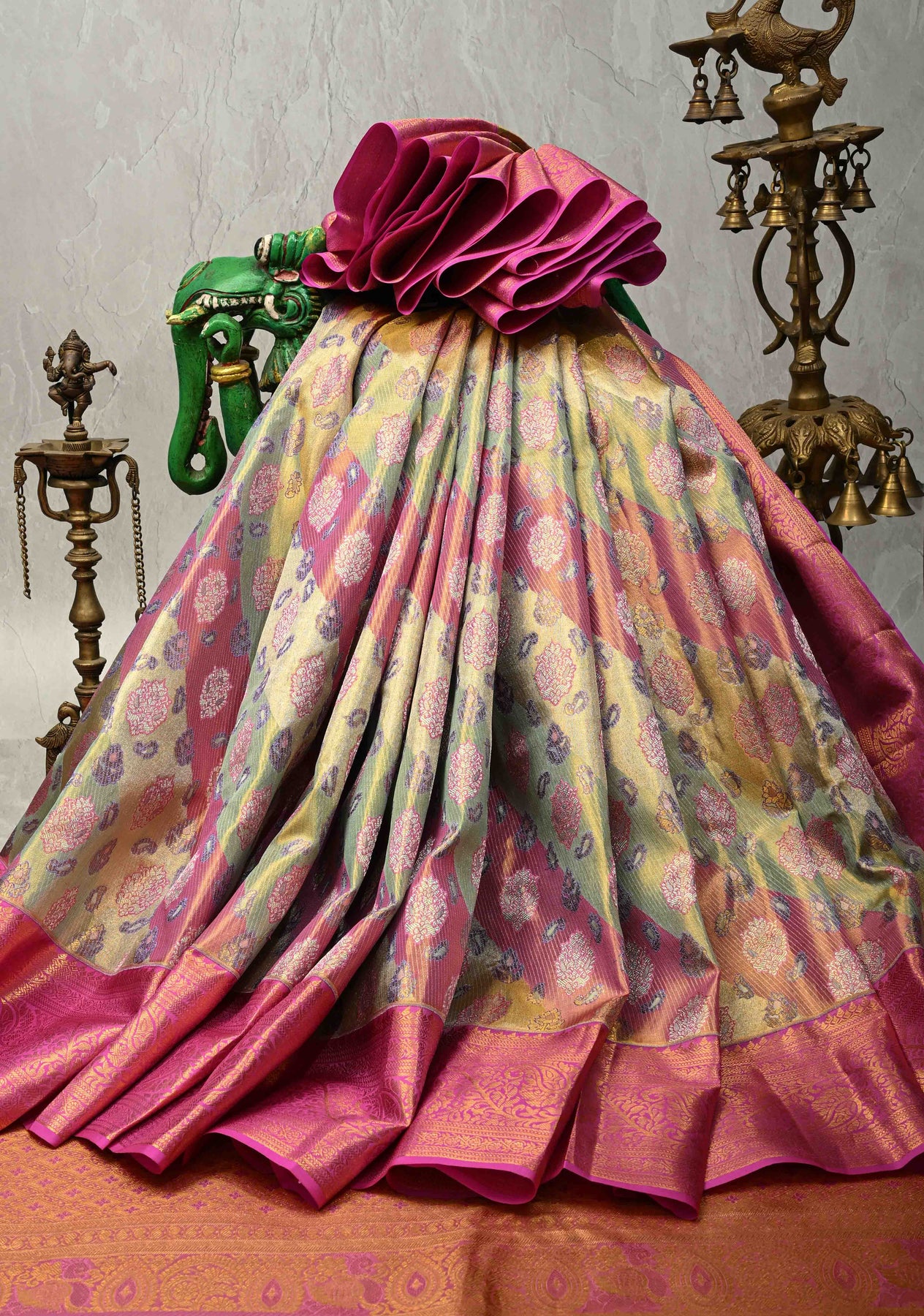 Experience the breathtaking radiance of our Pink-Green Rangkaat Style Kanjivaram Tissue Silk Saree. Handwoven with an ethereal metallic sheen, this pure tissue silk masterpiece features a vibrant color-block transition adorned with a rhythmic diagonal pattern. The opulent zari border provides a regal frame, making it a standout choice for weddings and grand celebrations. Lightweight yet luxurious, this saree perfectly blends traditional Kanjivaram heritage with a contemporary, high-glamour aesthetic.