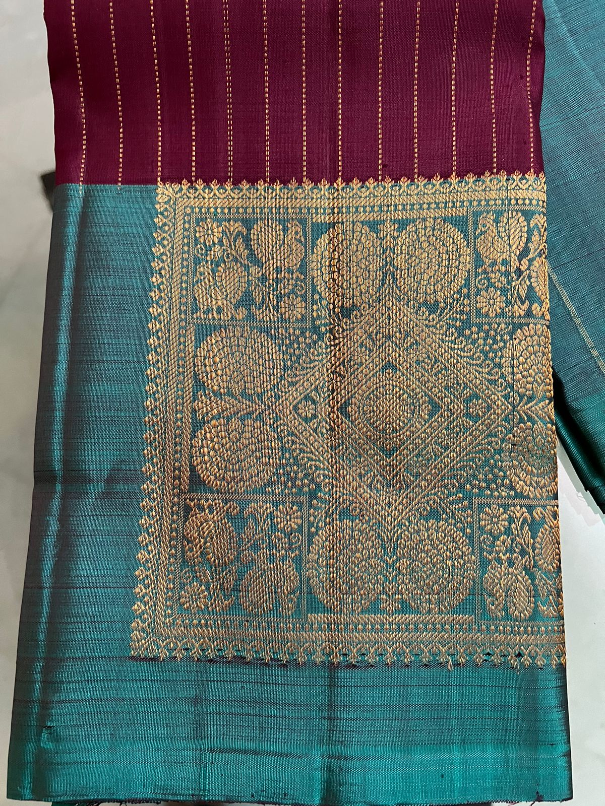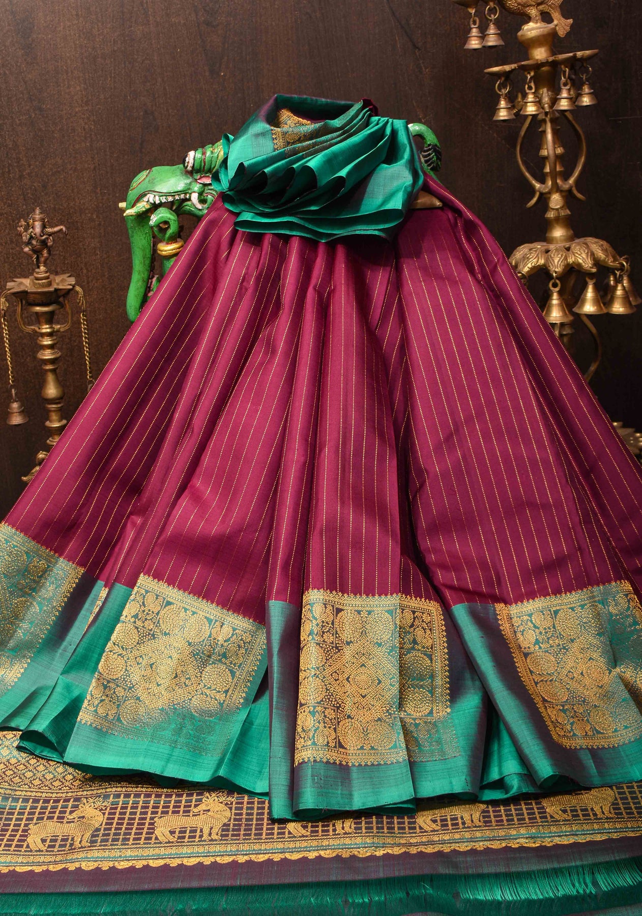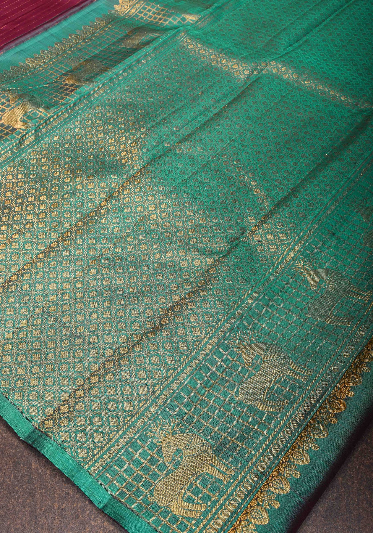 This luxurious Plum Pure Kanjivaram Silk Saree is a statement of sophistication and tradition. The saree features elegant zari stripes that shimmer across the rich plum fabric, adding a refined texture. The striking teal border enhances the saree's visual appeal, while geometric zari buttas scattered across the body provide a modern twist on classic designs. Perfect for weddings, festive celebrations, or special events, this saree blends traditional Kanjivaram craftsmanship with contemporary geometric patterns. The rich plum, complemented by the vibrant teal and intricate zari detailing, makes this saree a stunning and memorable choice for any occasion.