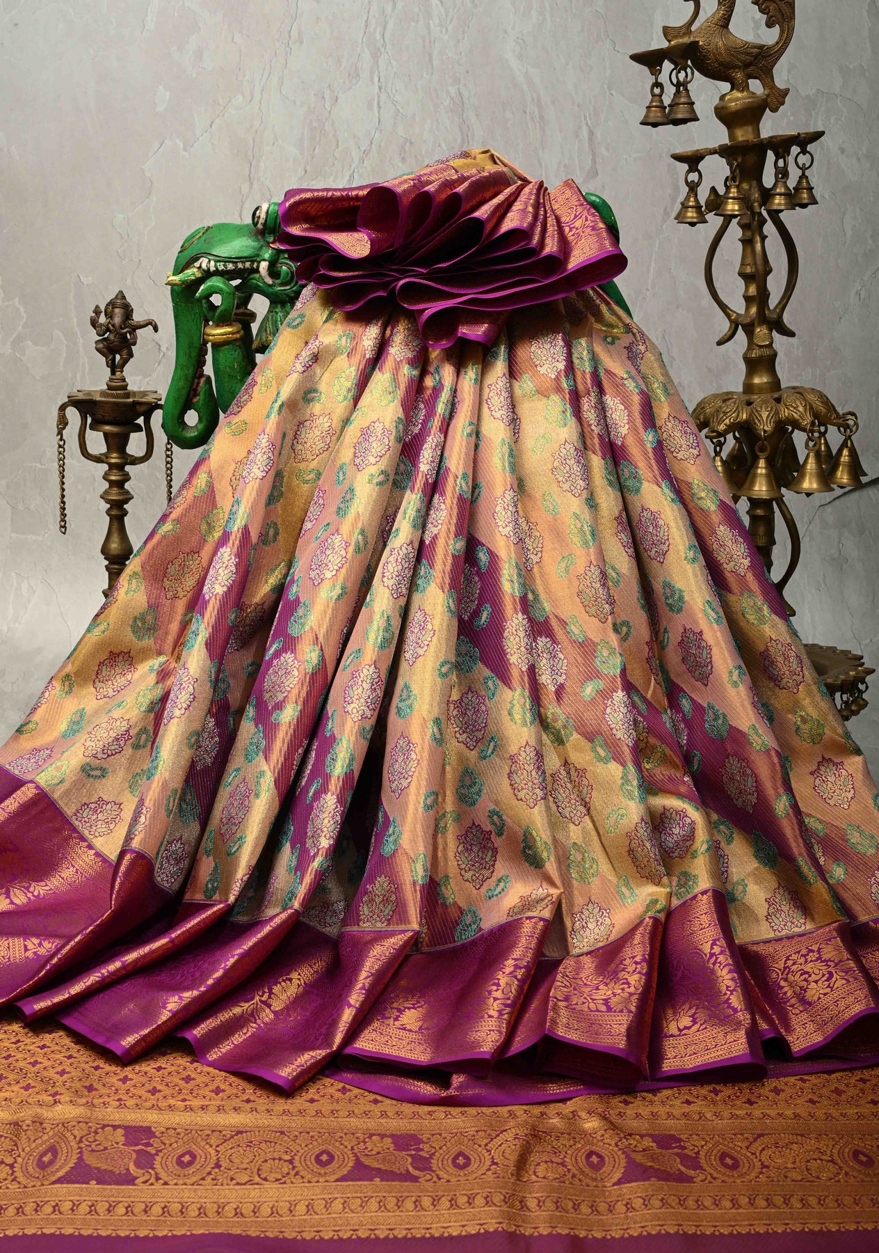 Indulge in the regal charm of this Purple-pink Rangkaat Style Kanjivaram Silk Saree. Expertly handwoven from pure silk, it features a vibrant play of colors enriched with delicate floral buttas. The body is adorned with sophisticated diagonal stripes, creating a fluid sense of motion, while the traditional rich zari border adds a majestic finish. Perfect for weddings and grand festivities, this masterpiece celebrates the timeless heritage of Kanjivaram artistry.