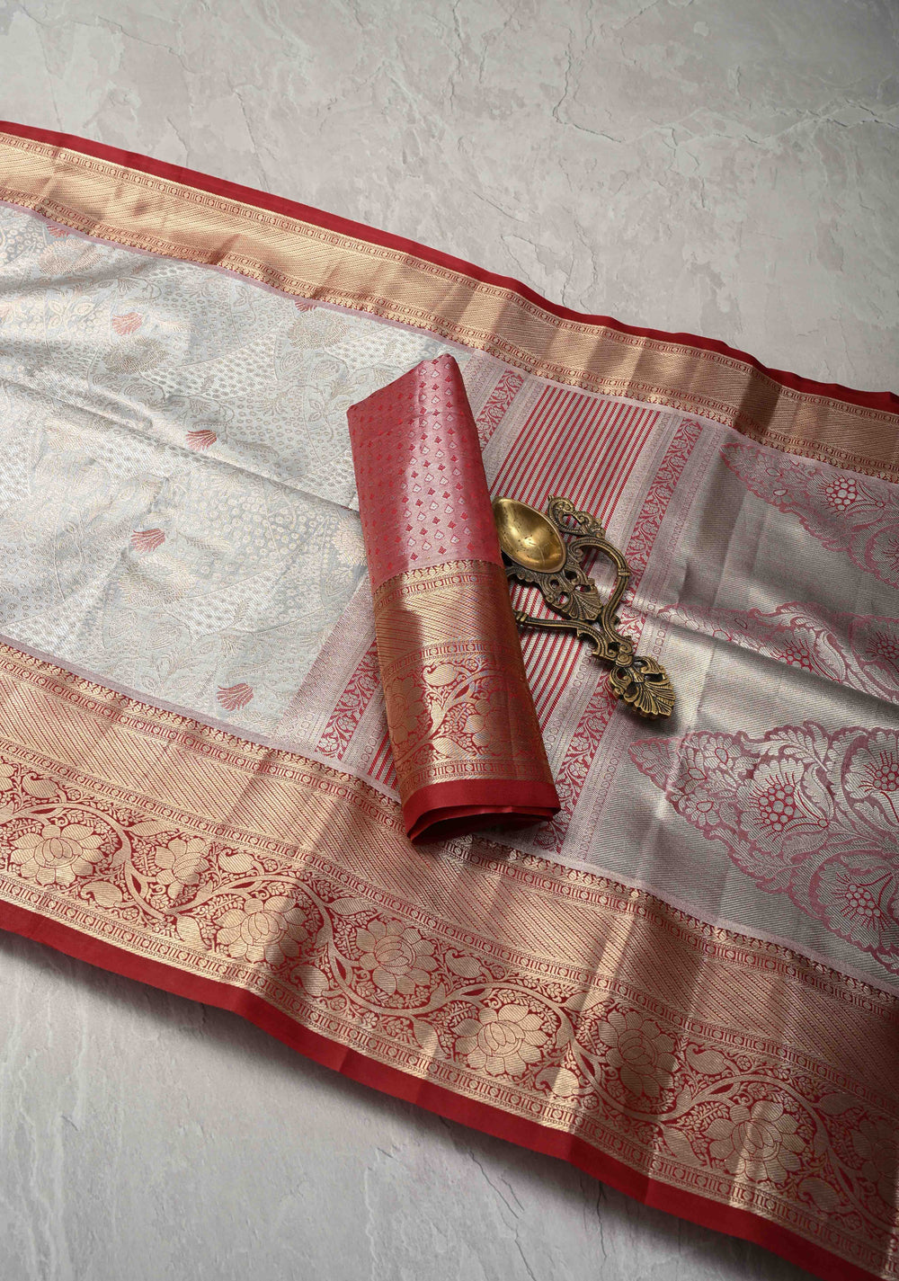 Gray Brocade on Kanjivaram Tissue Semi Silk Saree with Meenakari Buttas and Contrast Zari Border