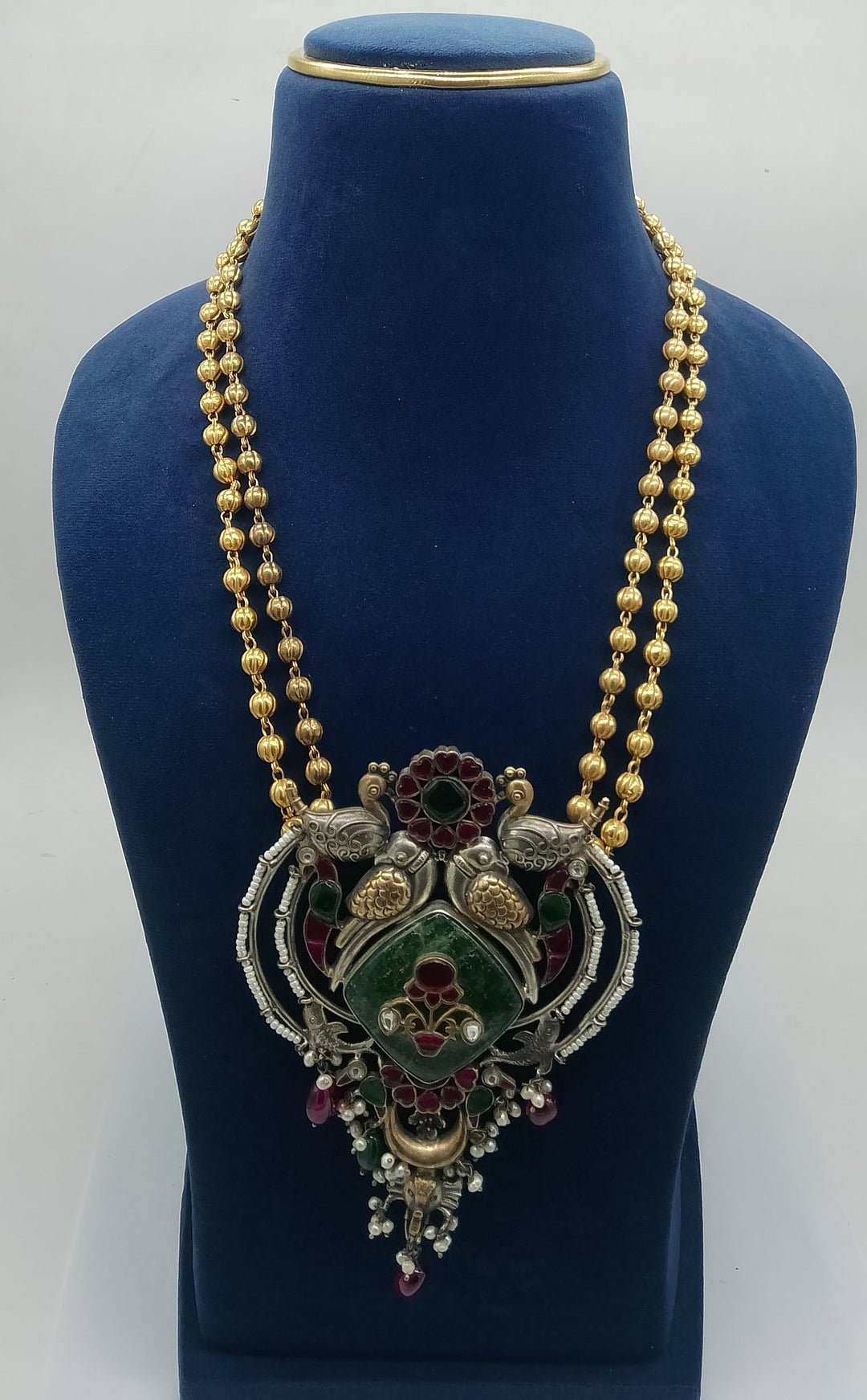 92.5 Silver Dual-Tone Gold and Oxidized Silver Jadau Statement Necklace with Chunky Green Stone and Bird Motifs