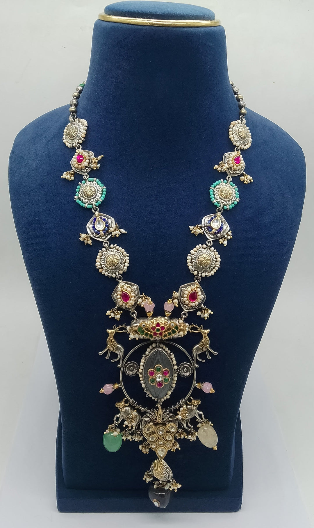92.5 Silver Dual-Tone Oxidized Silver and Gold-Plated Jadau Statement Necklace and Multi-Stone Accents