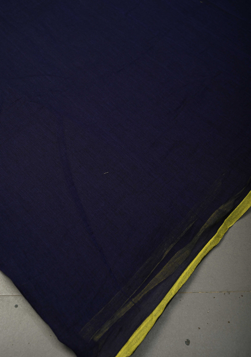 Navy Blue Mulmul Cotton Saree with Yellow Long Tassels, No Blouse Piece