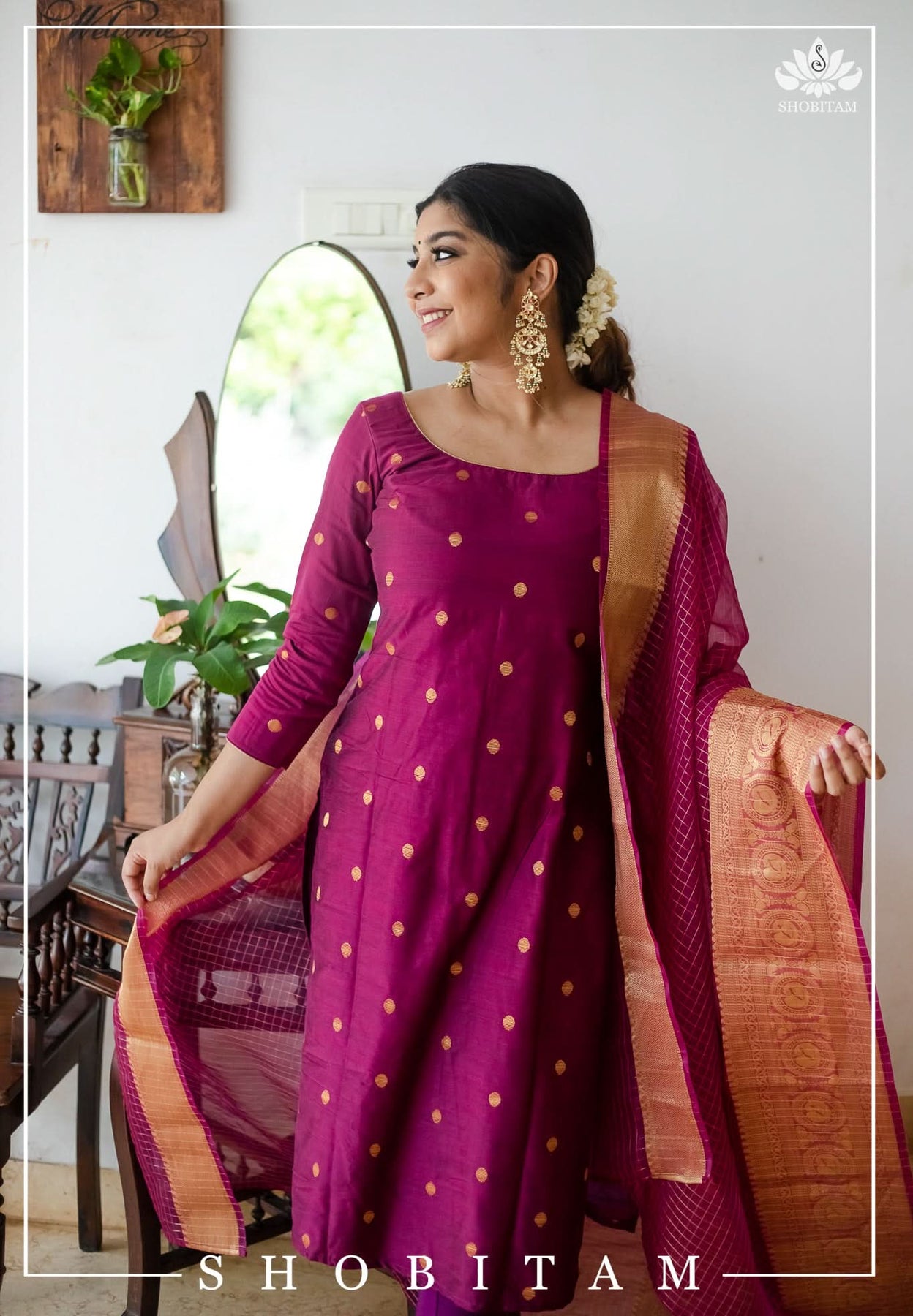 The vibrant and saturated Magenta color comes together in a comfortable silhouette to ring in ethnic spirits. Magenta chanderi slub Kurti combined with zari checks soft organza dupatta with rich zari border is a perfect outfit for this festive season. Let the celebrations begin in style!