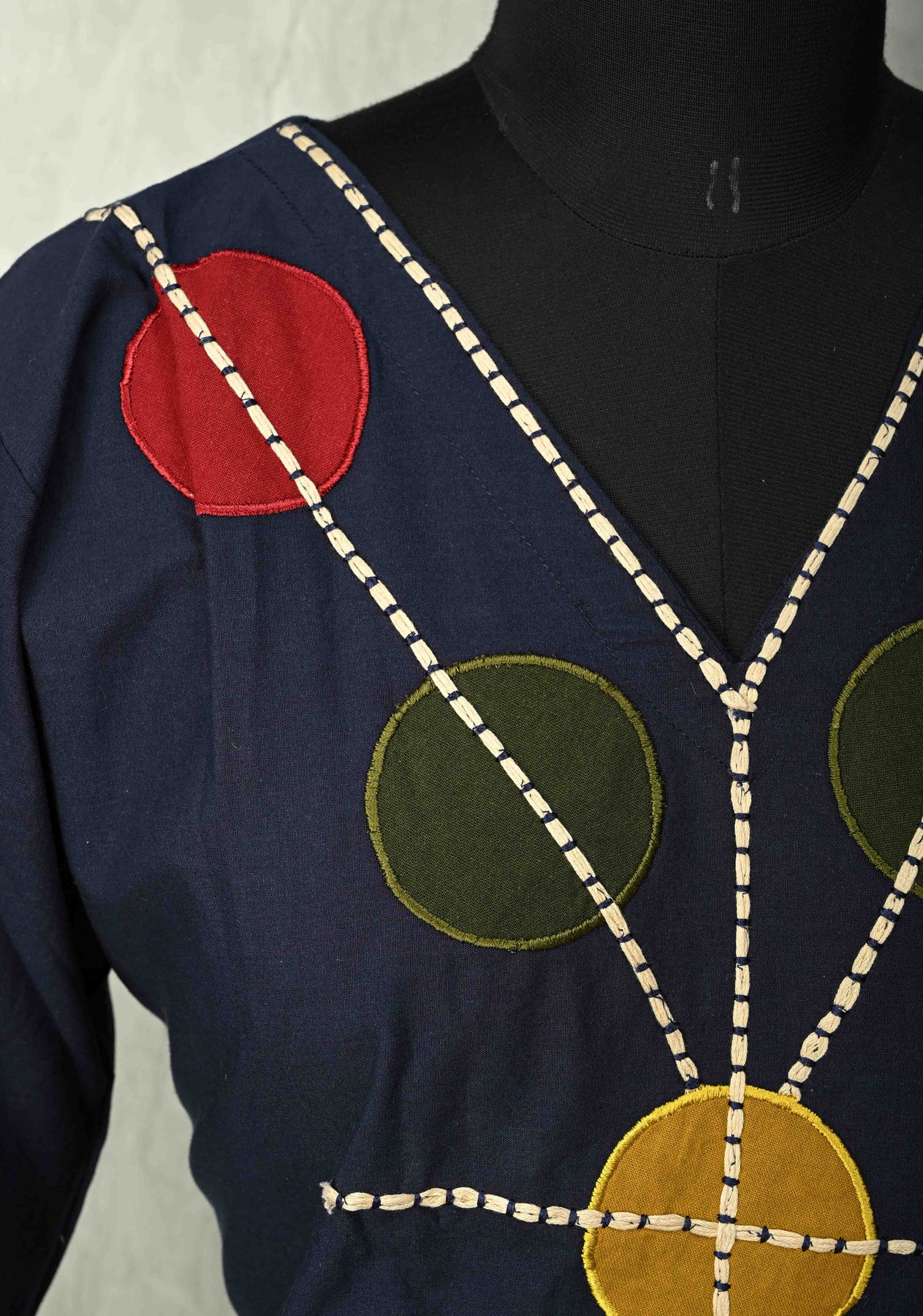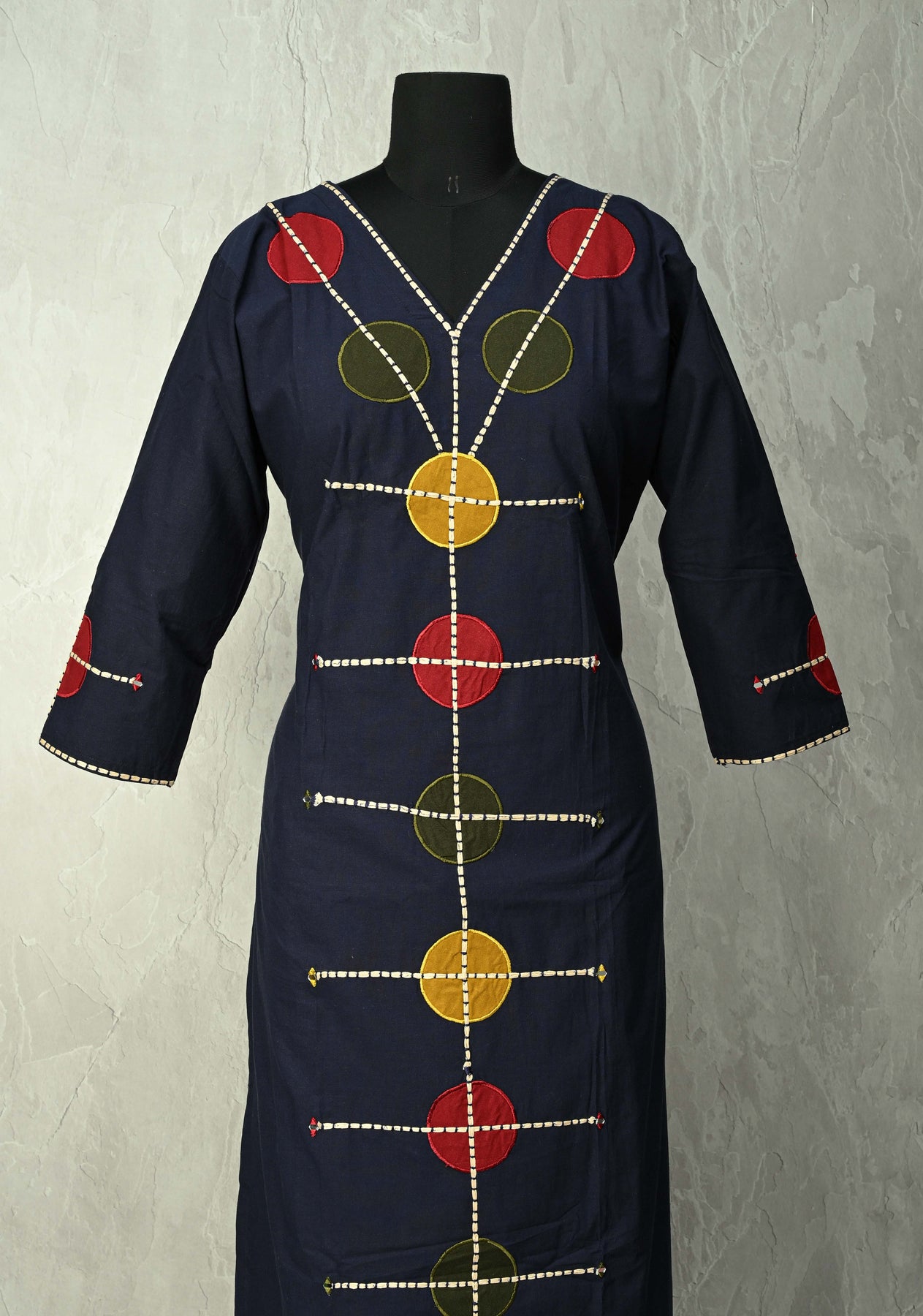 Make a bold statement with this Navy Cotton Designer Patch Kurti Set. The kurti features striking multicolor circular appliques aligned along the front with contrast stitch highlights, paired with matching straight pants for a sleek silhouette. Crafted in breathable cotton , it blends everyday comfort with contemporary ethnic flair, ideal for workdays, outings, and festive get‑togethers..