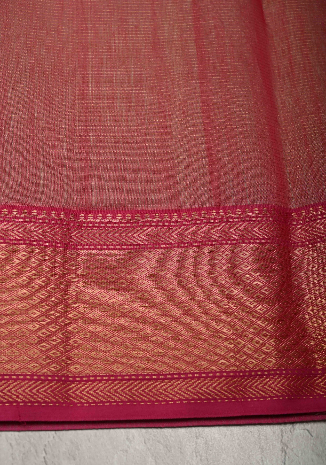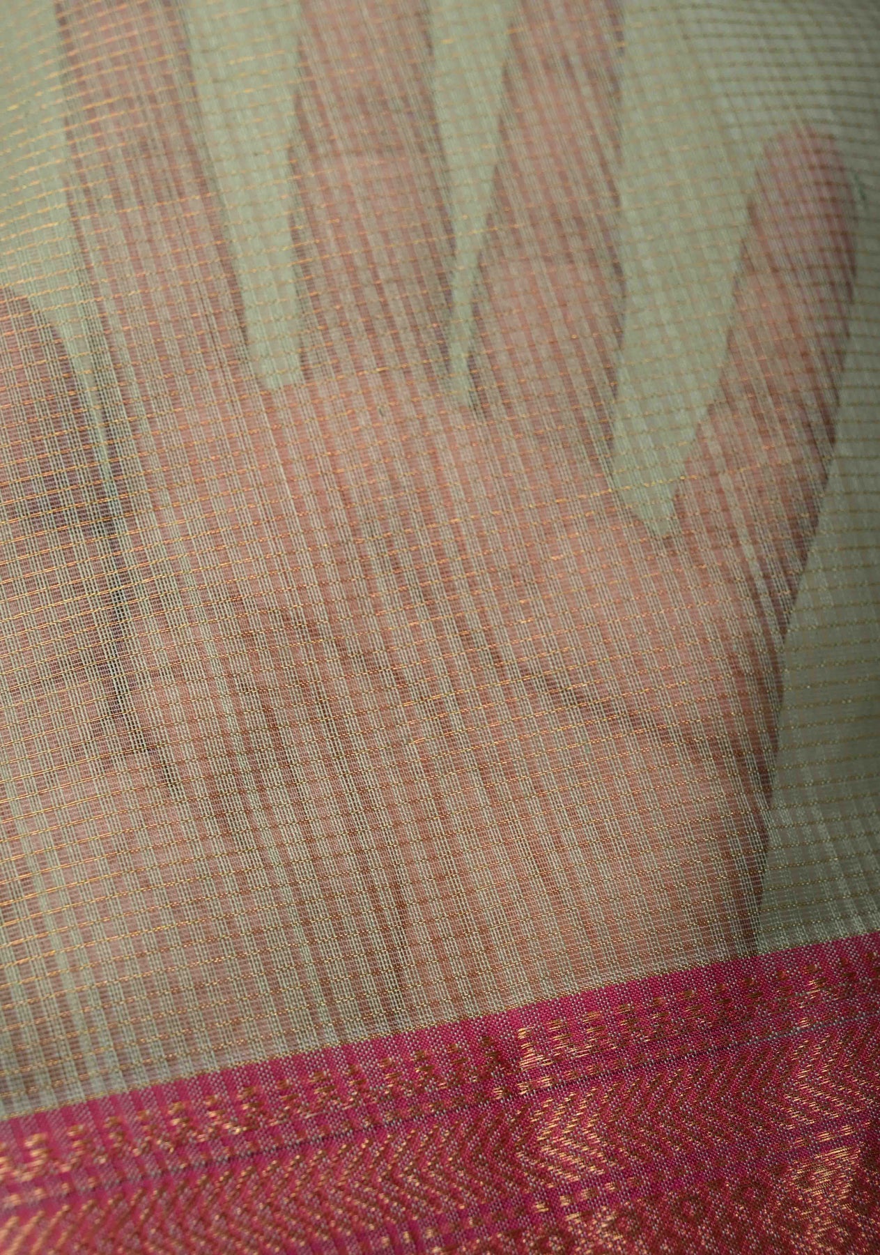 Gracefully blending tradition with everyday elegance, this Tea Green Handwoven Maheshwari Silk Cotton Saree is a celebration of lightness, texture, and heritage. Woven with care by skilled artisans, the saree features delicate tissue checks that shimmer subtly against the soothing tea green base. The breathable silk-cotton blend ensures comfort without compromising on sophistication. A striking contrast Zari border adds definition and a touch of festive glamour. Perfect for cultural events, intimate gatherings, or elegant day wear, this saree pairs beautifully with minimalist jewelry and a tailored blouse.