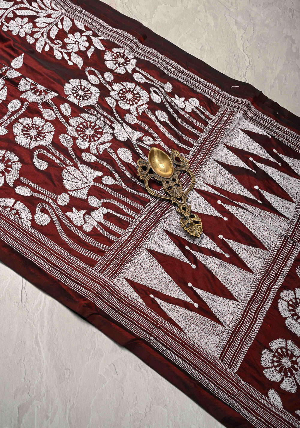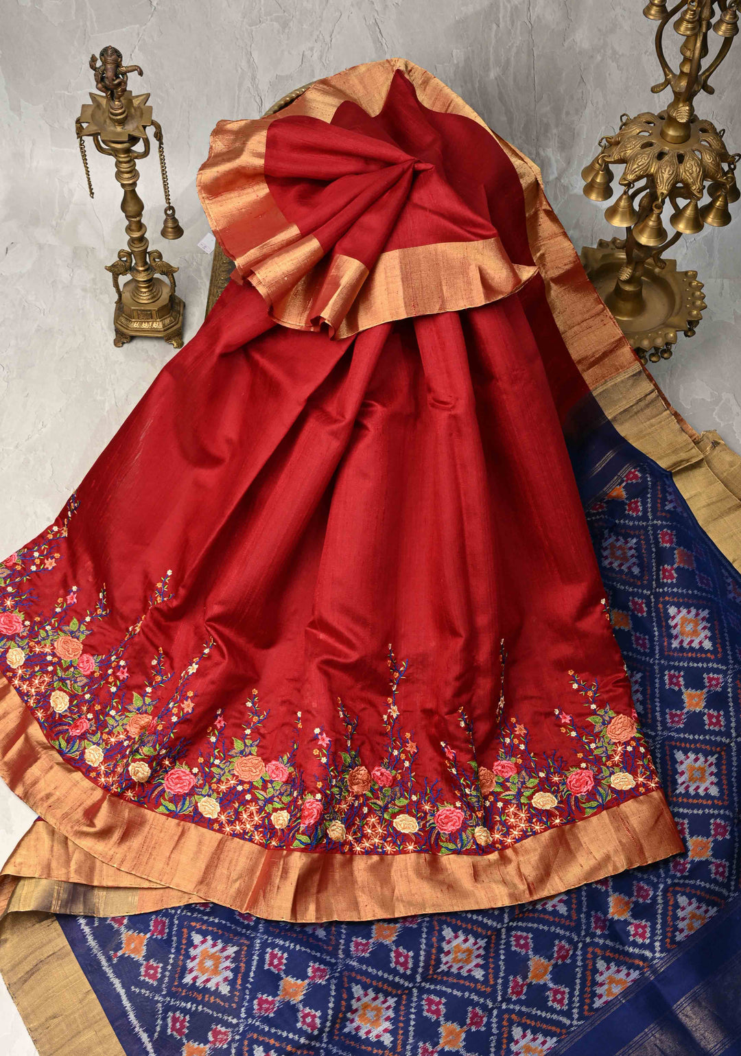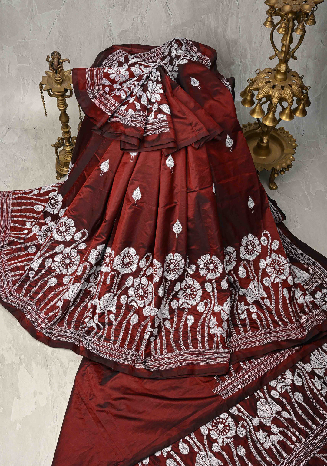 • Maroon silk sarees with minimal embroidery strike a balance between elegance and comfort.
