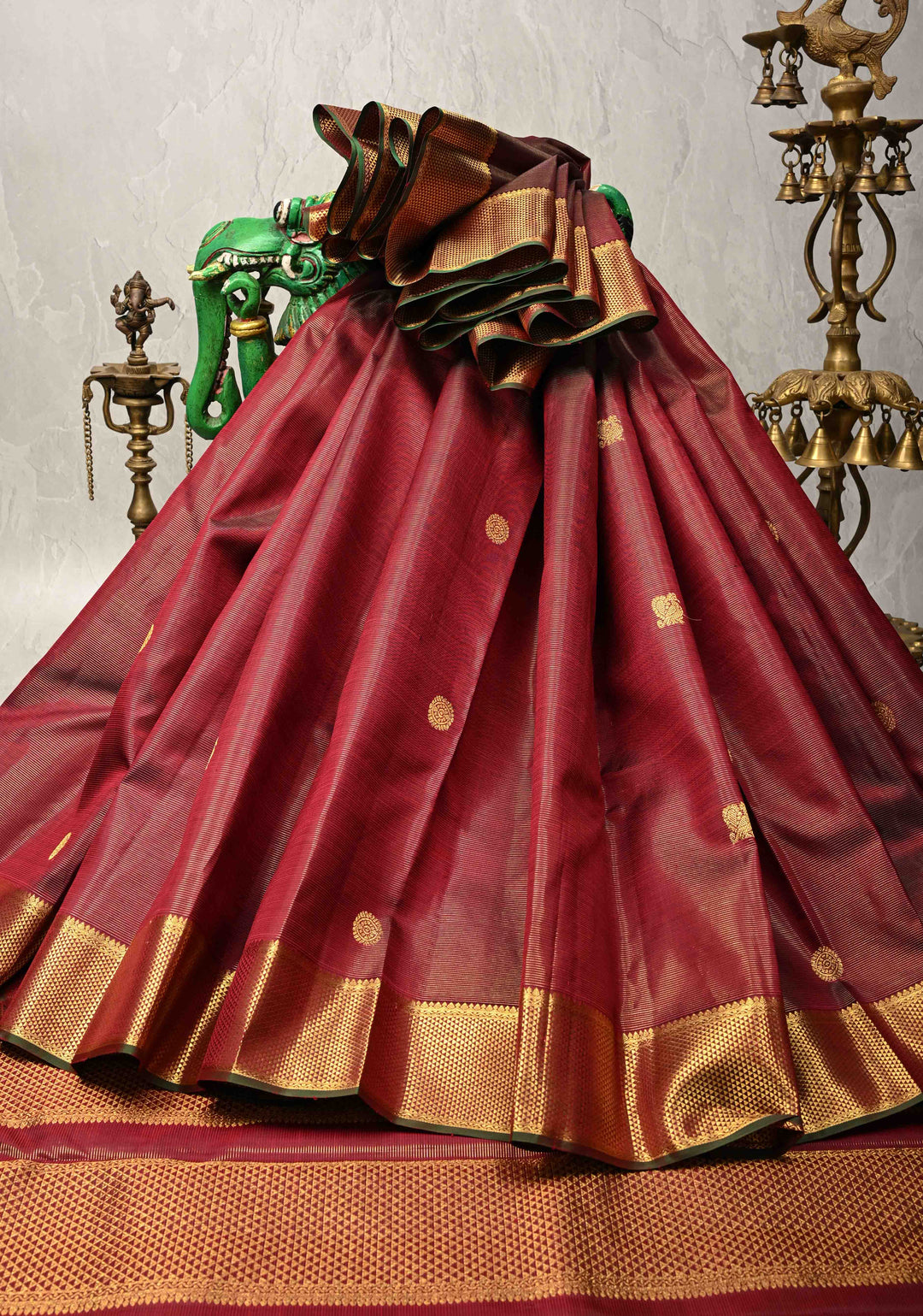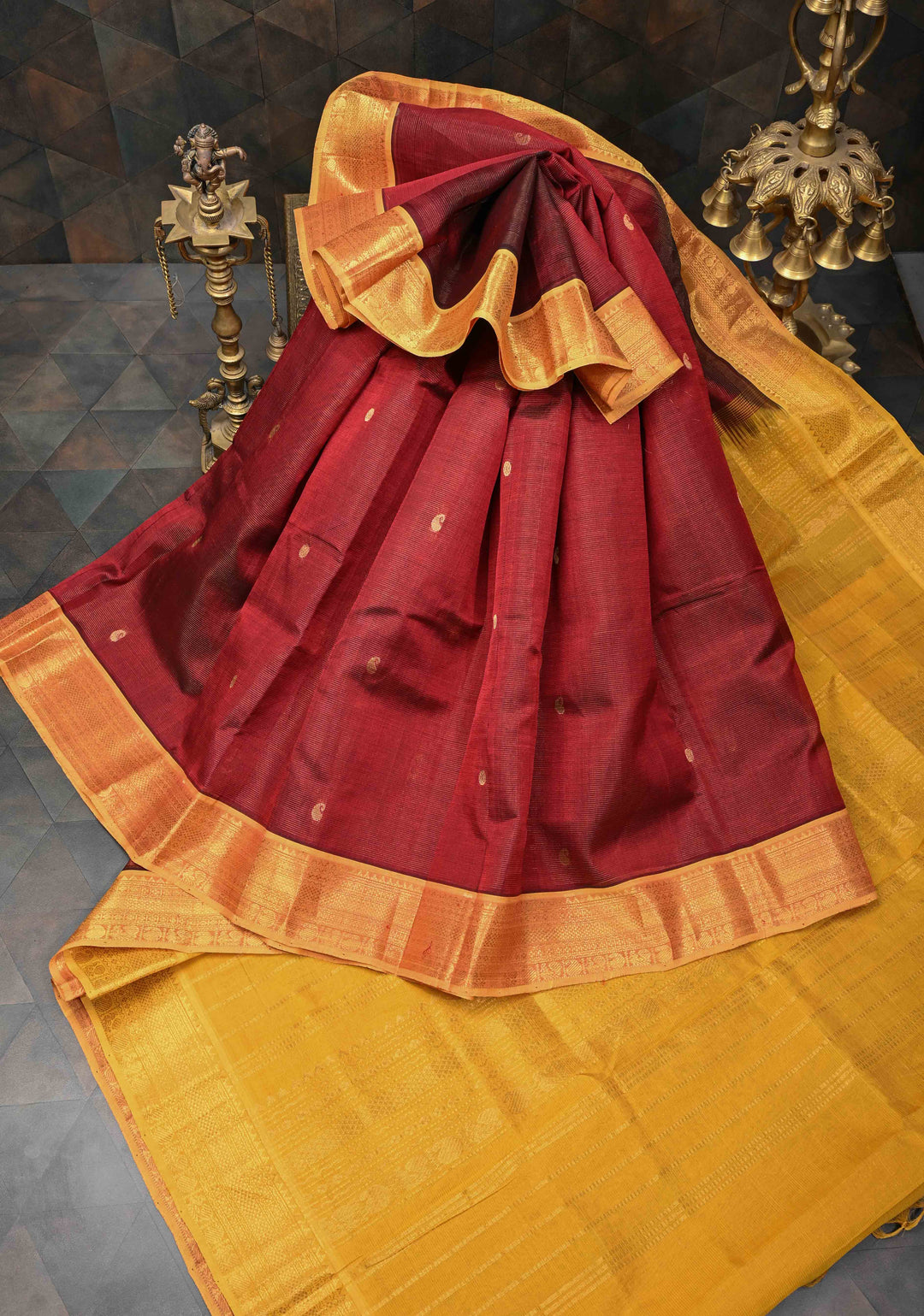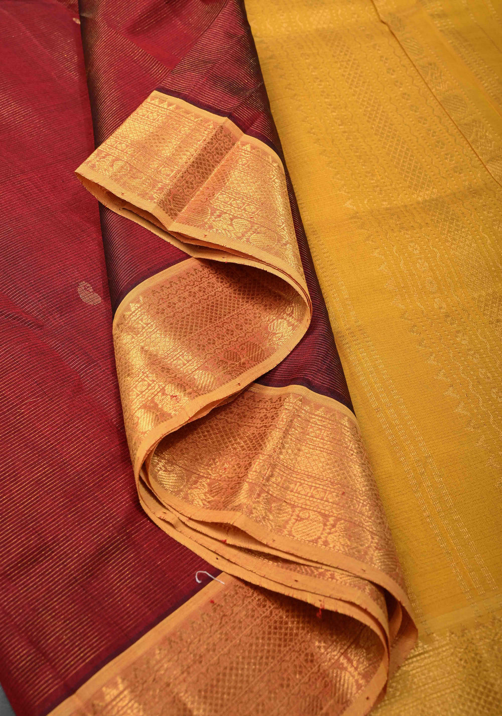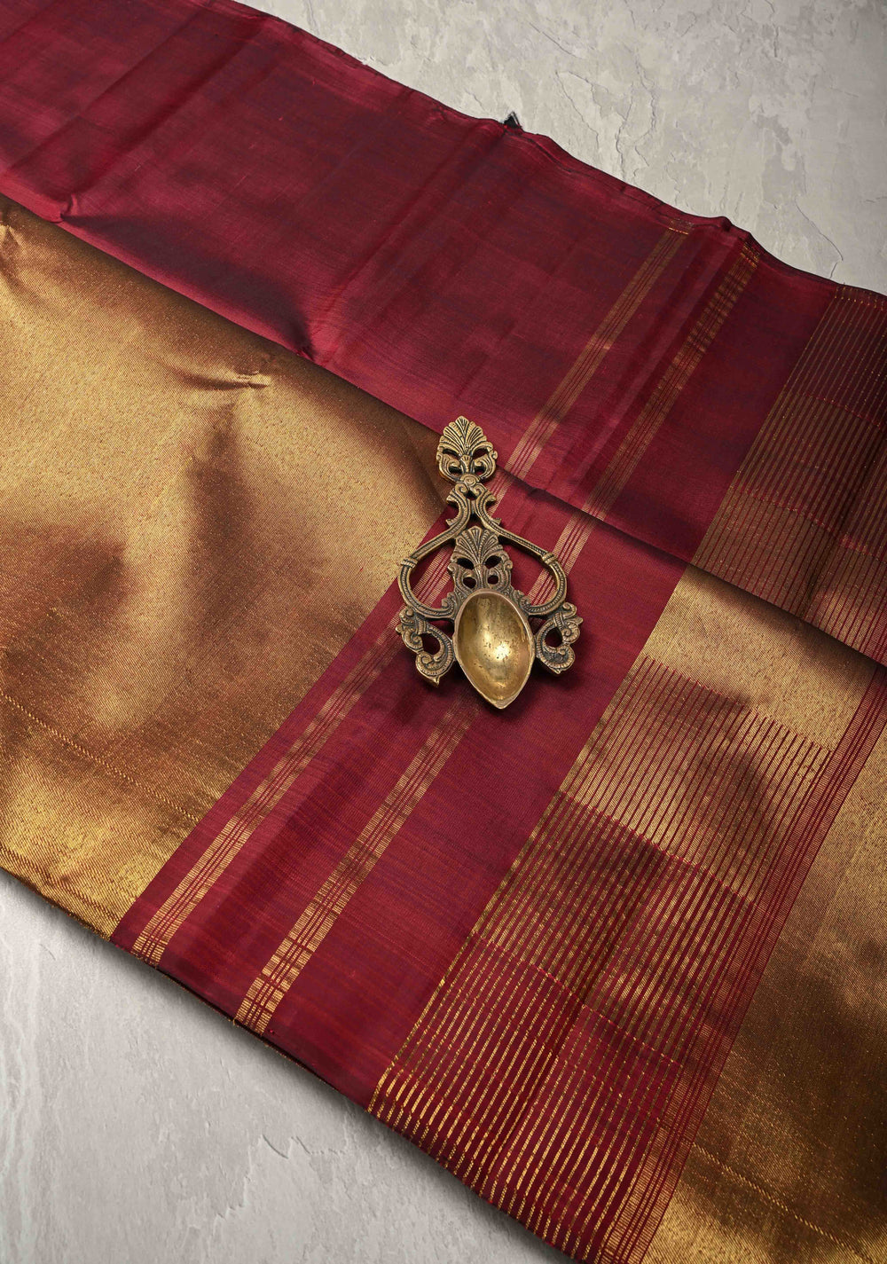• Luxurious Silk & Real Gold Threads: The Kanjivaram maroon saree is woven from the finest silk, making it rich in texture and durability. The addition of real gold threads enhances its sheen, giving it a divine glow that stands out on any occasion.