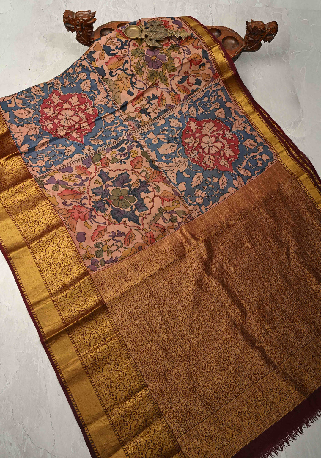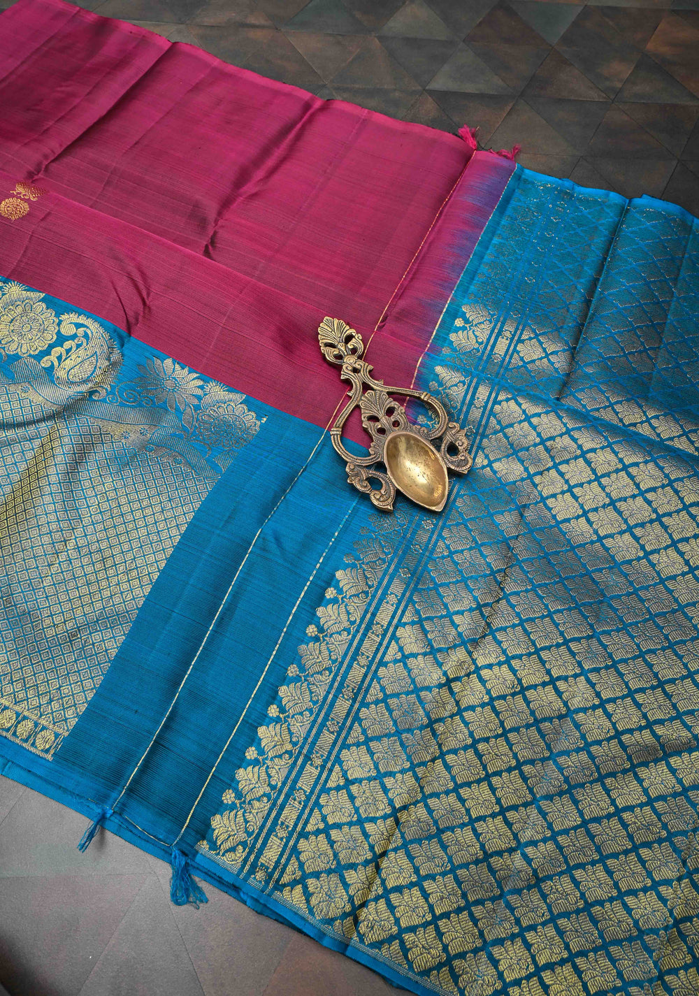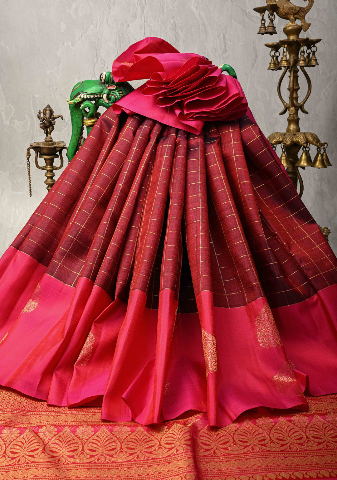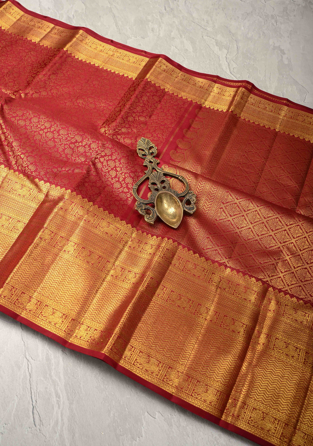 • Luxurious Silk & Real Gold Threads: The Kanjivaram maroon saree is woven from the finest silk, making it rich in texture and durability. The addition of real gold threads enhances its sheen, giving it a divine glow that stands out on any occasion.