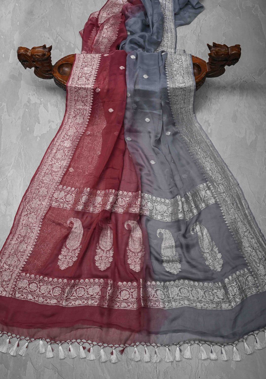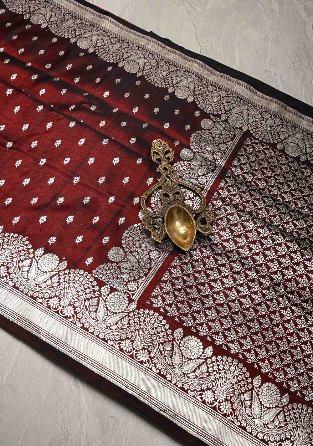 • Rich Fabric & Weaving: The Banarasi maroon saree is crafted from luxurious silk, known for its soft texture and regal feel. The fine weaving technique gives it a graceful drape that enhances your look effortlessly.