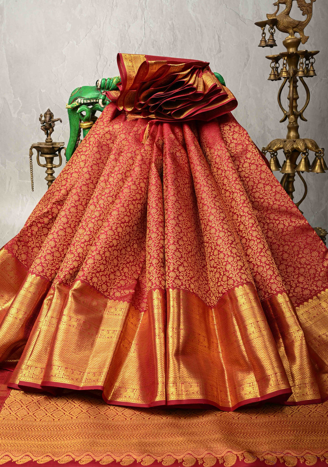 • Exquisite Gold Zari Work: Intricate gold zari patterns create a mesmerizing contrast against the deep maroon fabric. The delicate floral and paisley motifs make it an heirloom-worthy piece that reflects timeless artistry.