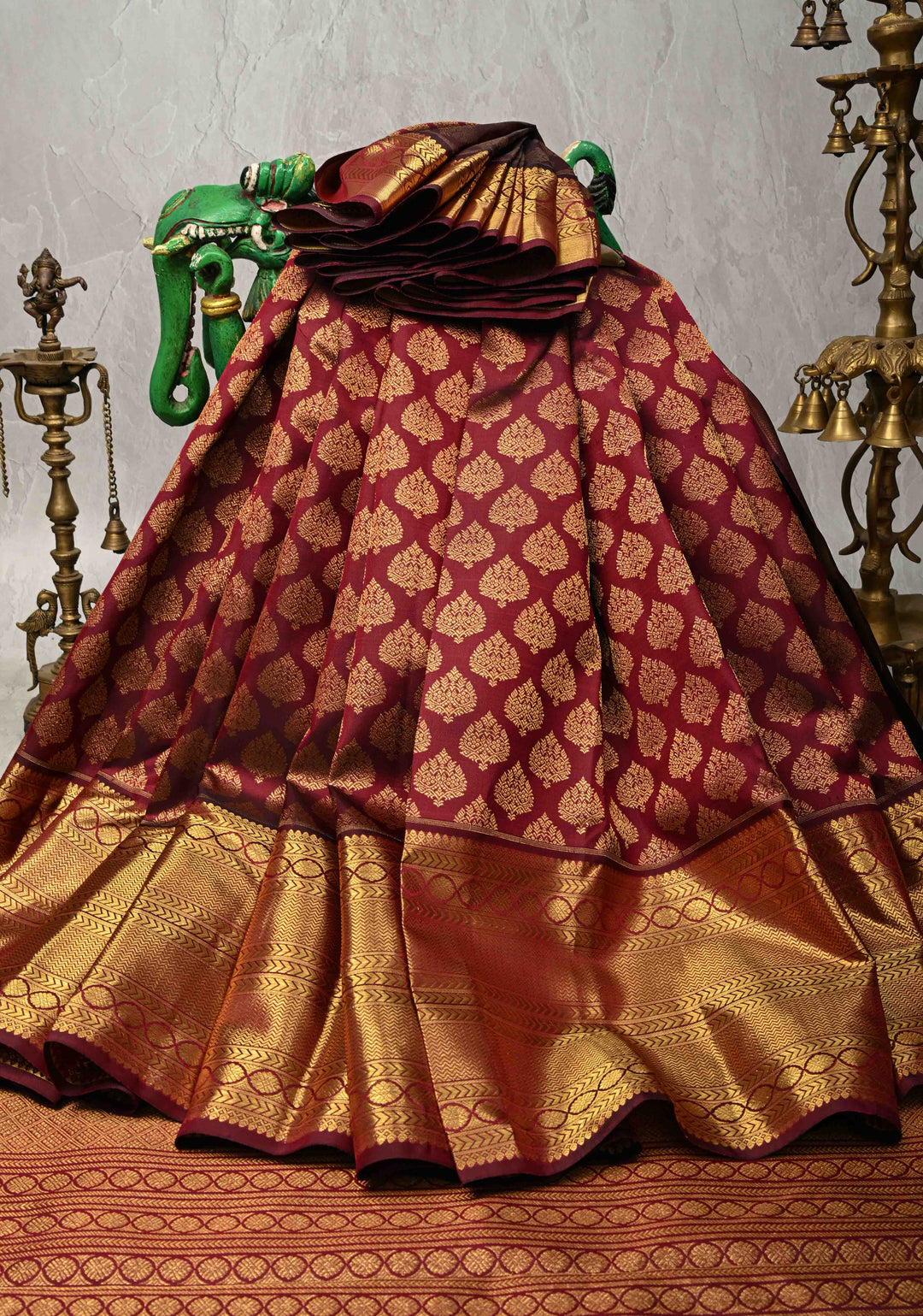A Kanjivaram maroon saree is not just attire; it’s a celebration of heritage, making every moment feel majestic!