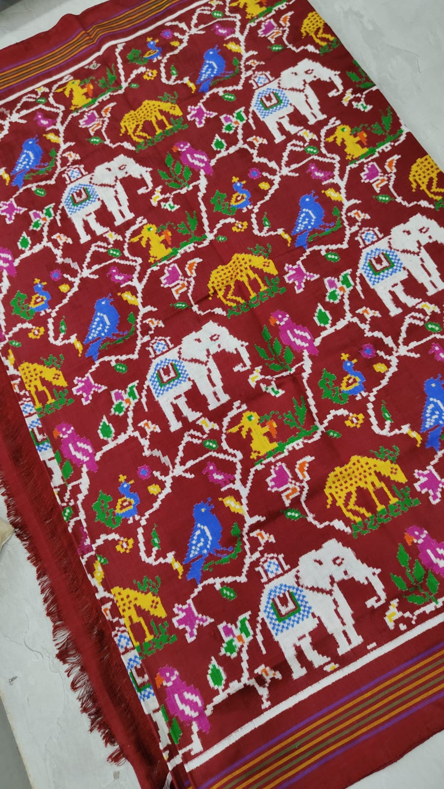 2. Striking Tie-Dye & Geometric Patterns: Bandhani sarees feature delicate dots and intricate designs, while Patola sarees are known for their symmetrical, vibrant motifs like elephants, flowers, and birds. These elements give the maroon saree a bold and festive appeal.