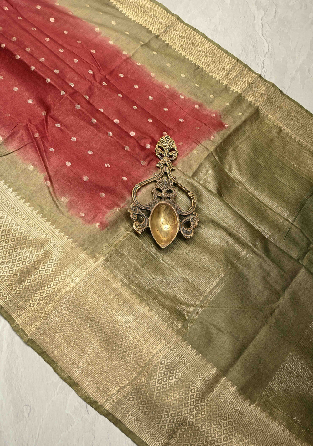 Exquisite Gold Zari Work: Intricate gold zari patterns create a mesmerizing contrast against the deep maroon fabric. The delicate floral and paisley motifs make it an heirloom-worthy piece that reflects timeless artistry.
