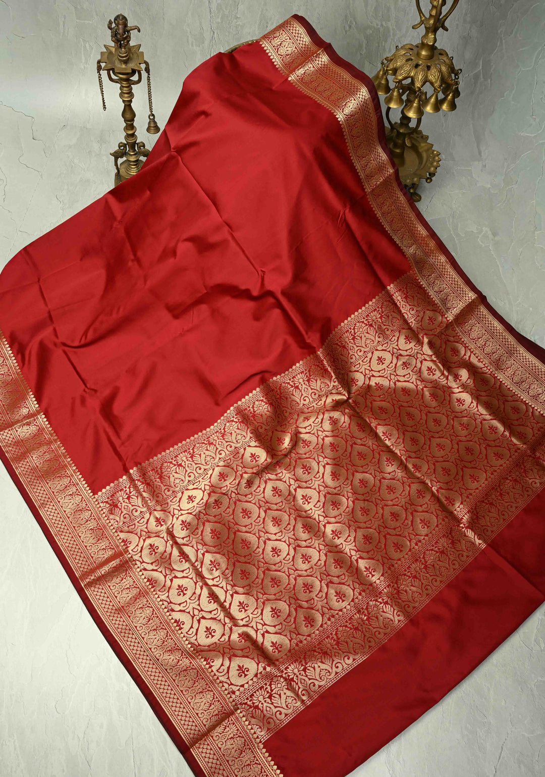 Rich Fabric & Weaving: The Banarasi maroon saree is crafted from luxurious silk, known for its soft texture and regal feel. The fine weaving technique gives it a graceful drape that enhances your look effortlessly.
