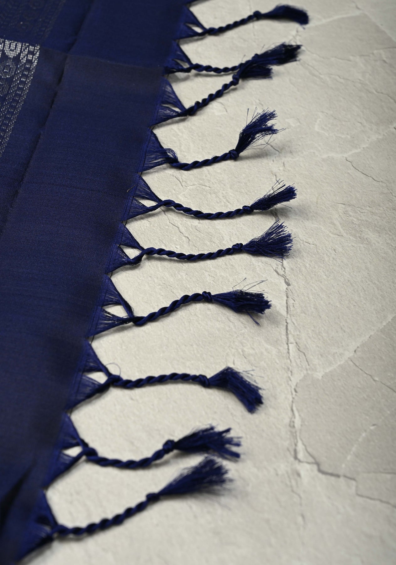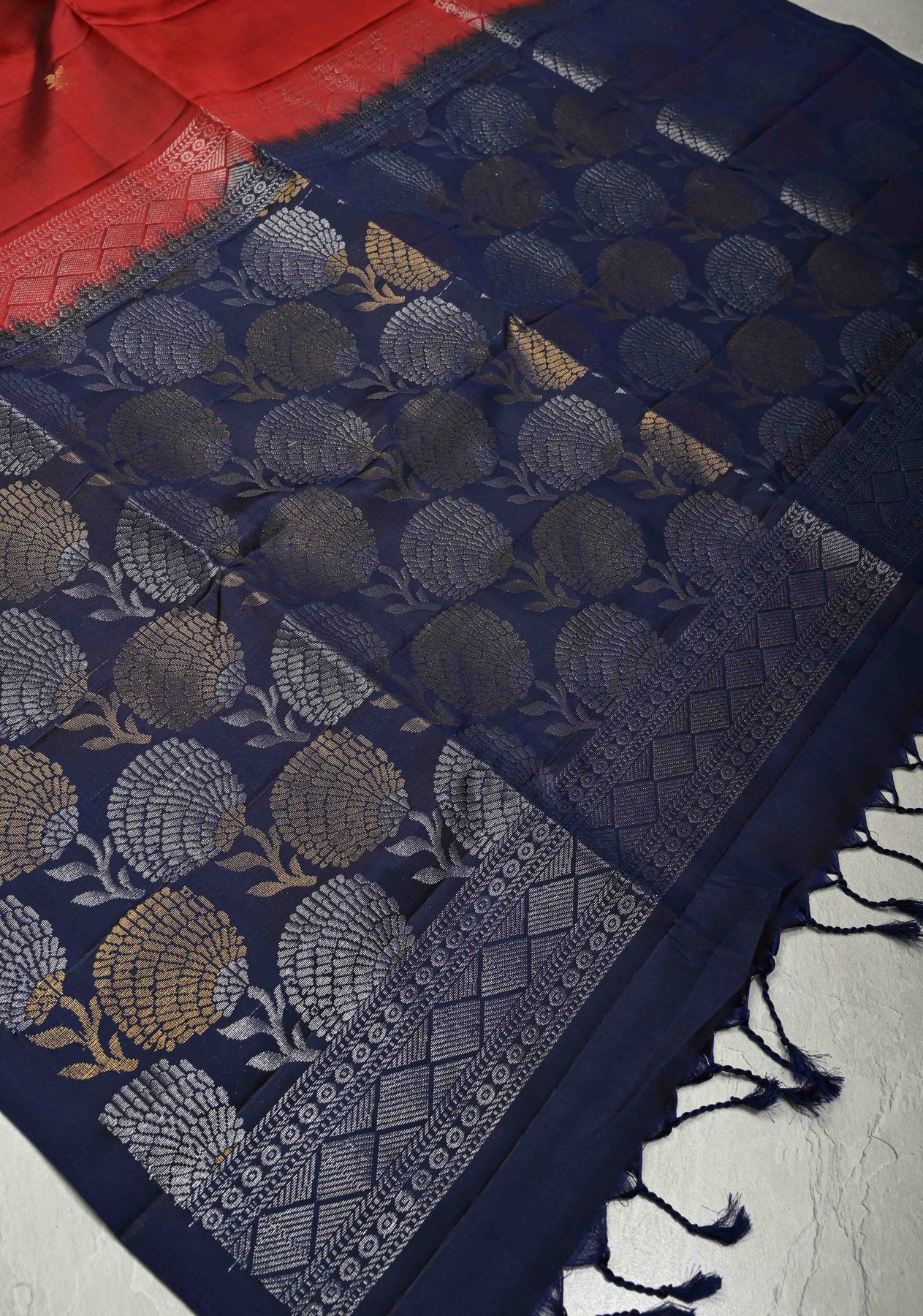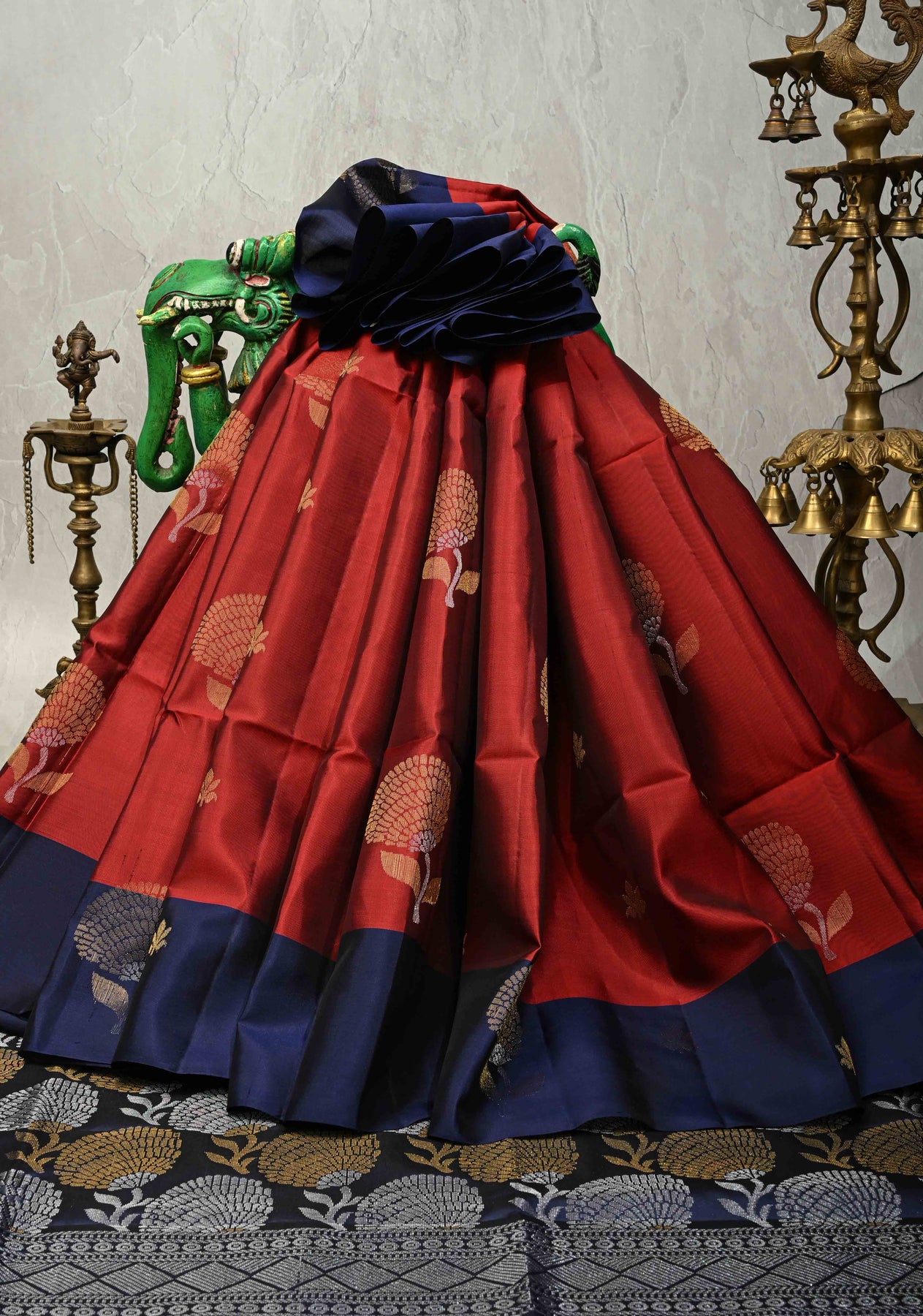 The brick maroon body is beautifully embellished with intricate gold-silver floral buttas, adding refined shimmer and artistic elegance. Enhancing the saree’s grandeur is a contrasting Navy Blue woven border, which provides depth, balance, and a striking finish. A perfect blend of classic hues and heritage artistry, this saree is a must-have for elegant ethnic styling.