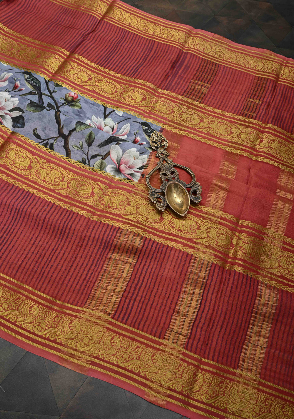 These sarees feature intricate borders of gold or silver zari, adding a regal charm. Ideal for festivities or as bridal sarees, they instantly make an impression.